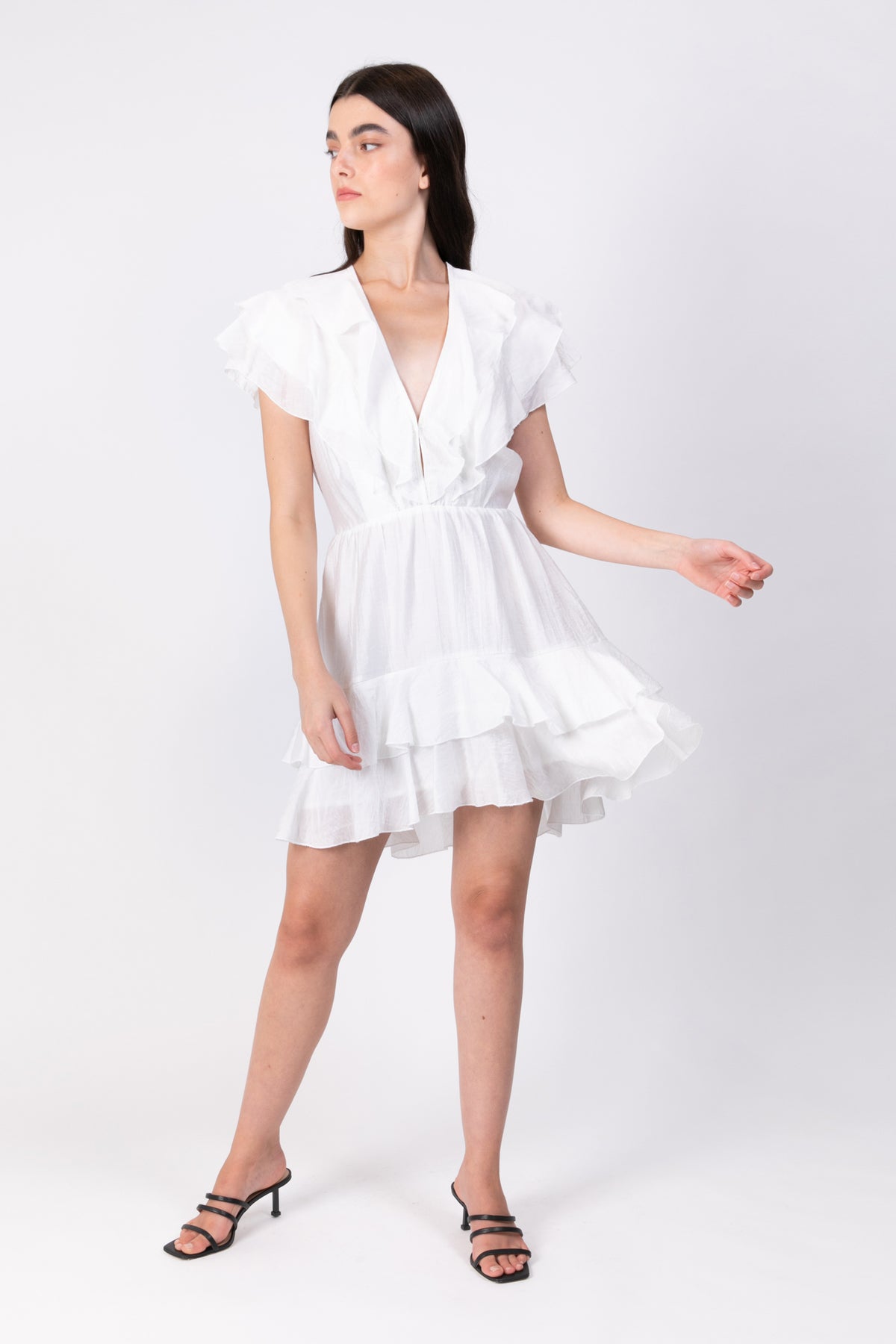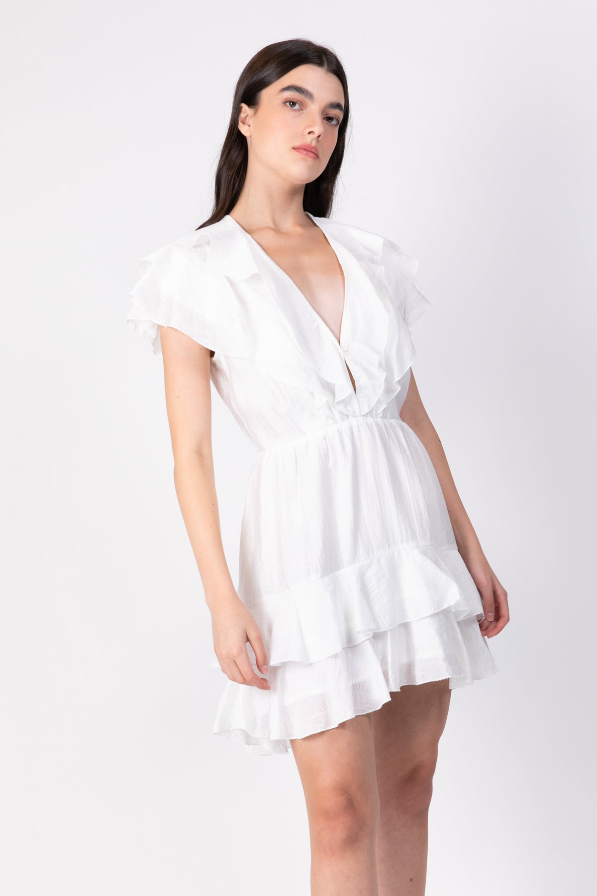 Woven viscose blend mini dress with v-neck and peplums.