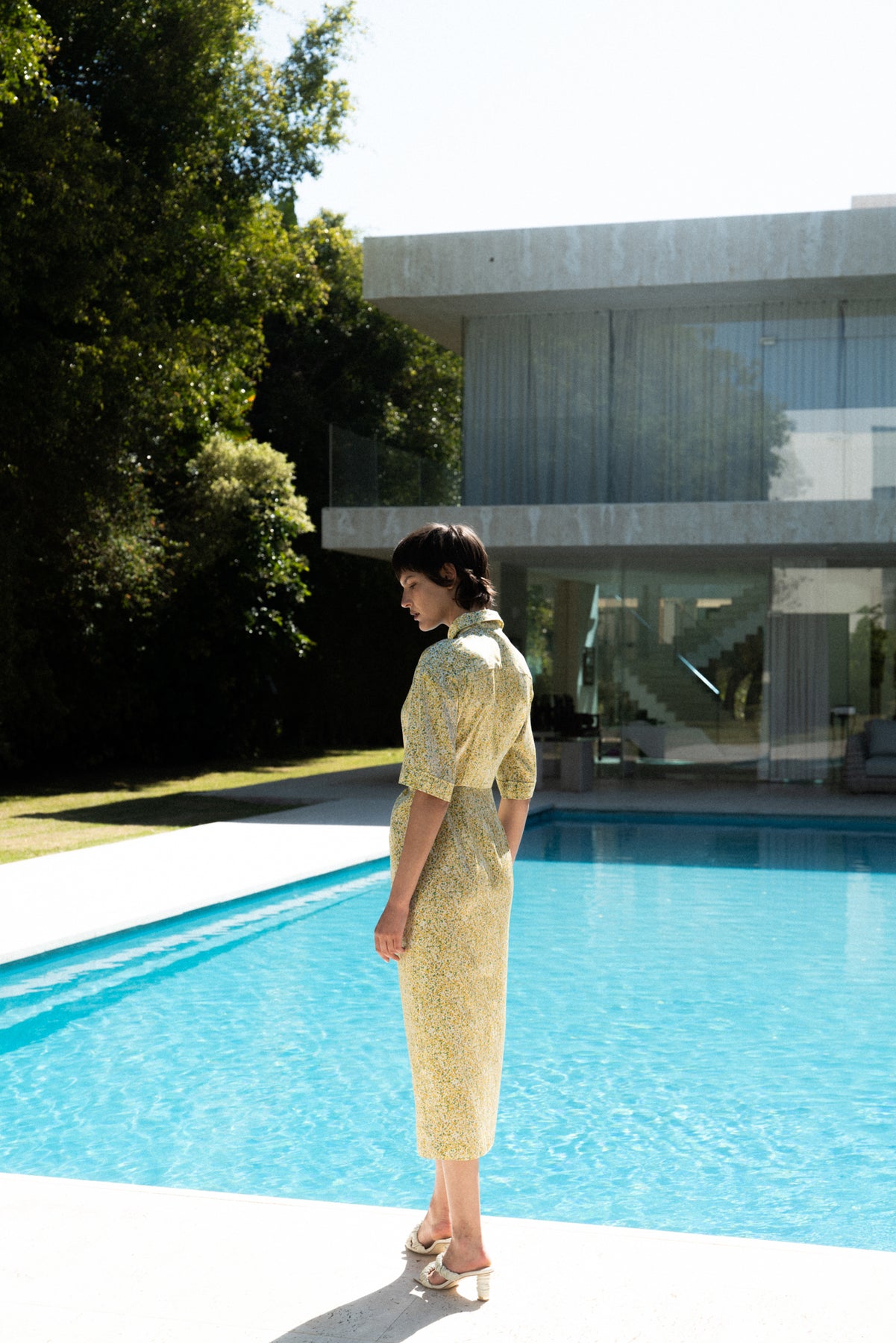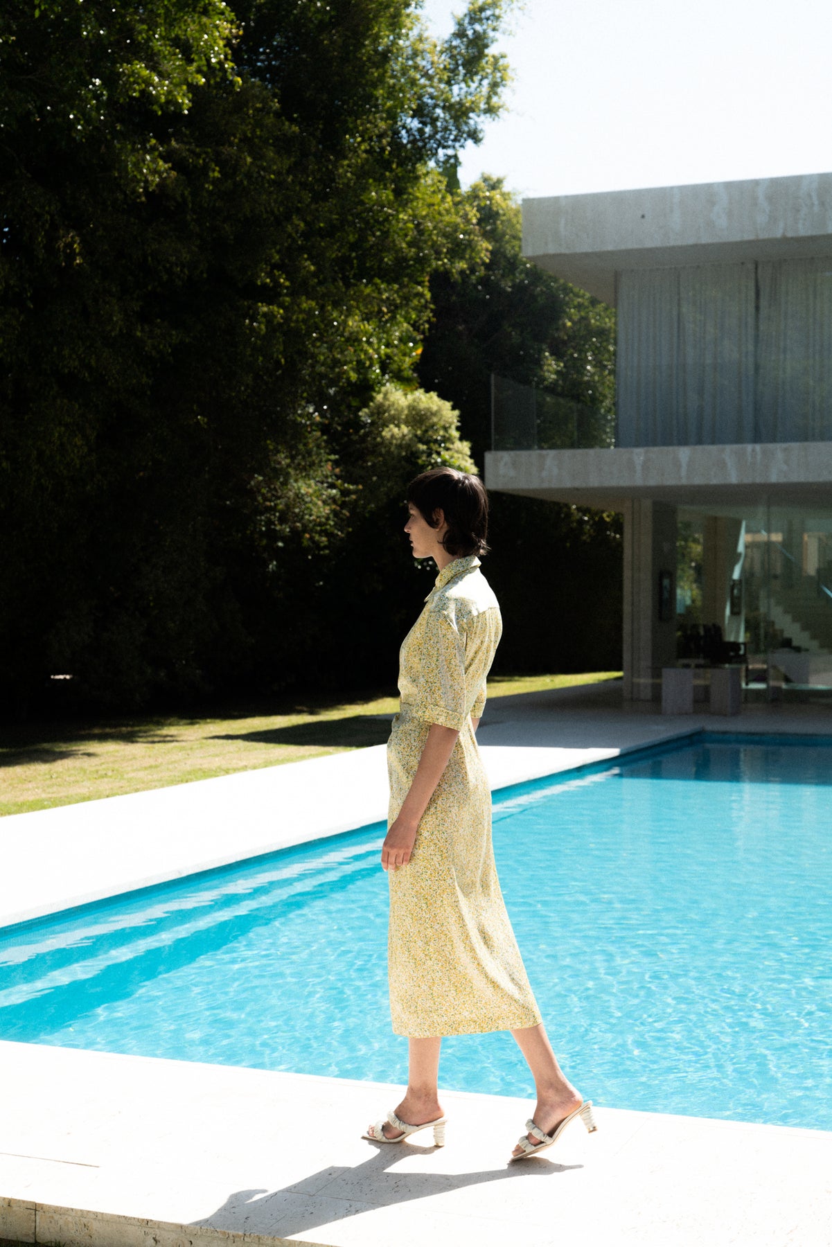 Shiny printed viscose midi dress with pleats in the front placket, collar, and short sleeves.