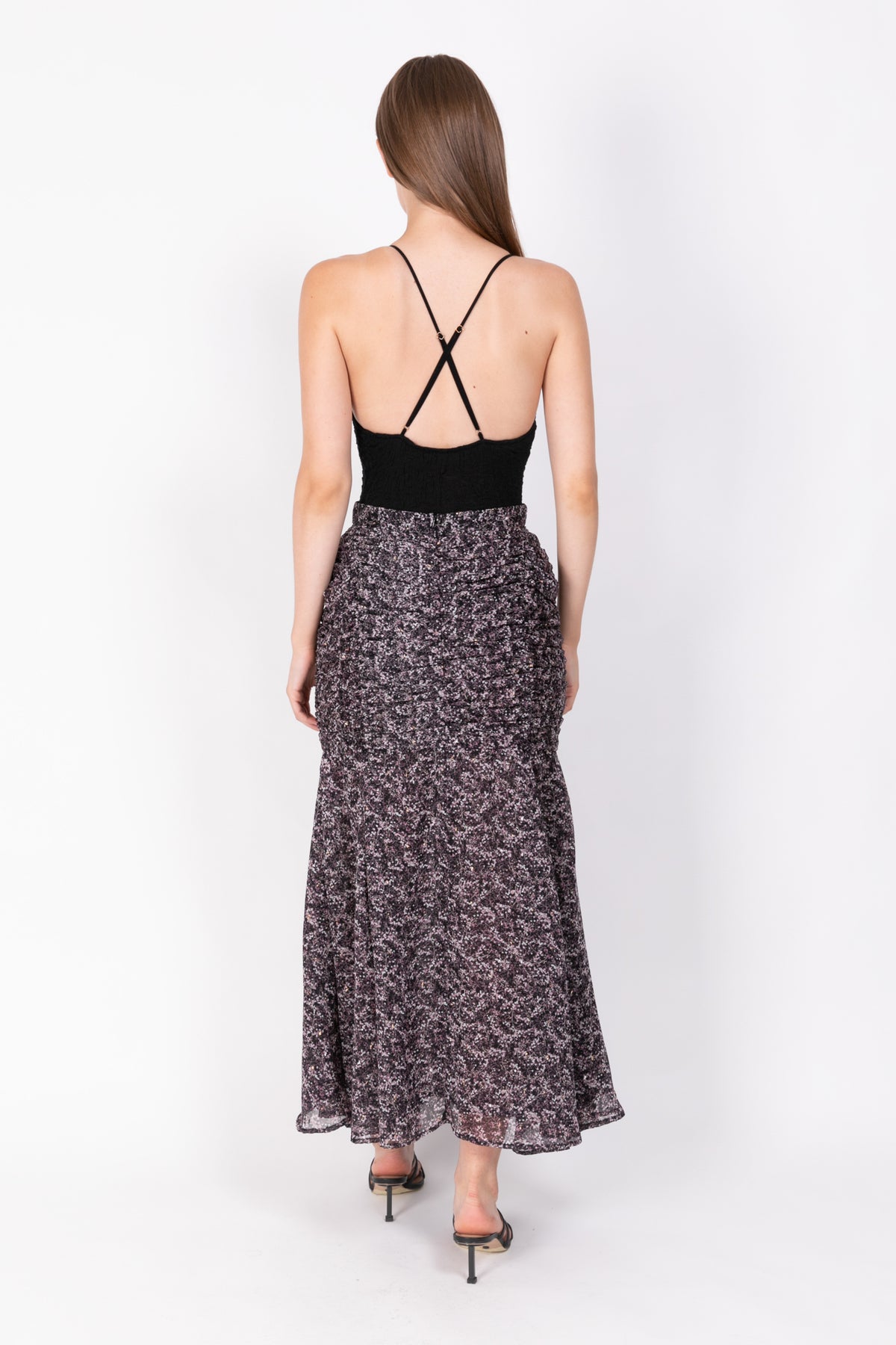 Printed chiffon with plumetti midi skirt with gathering details.