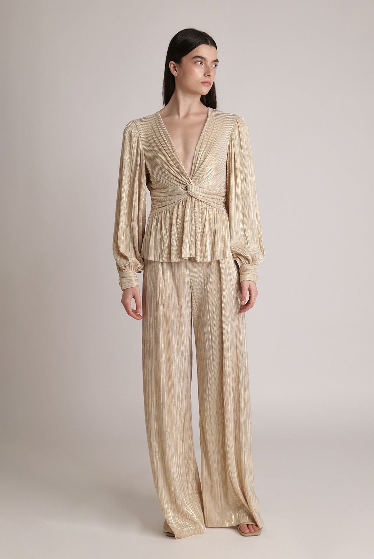 Pleated knit with foil top with deep V-neck, long sleeves, and knot detail at center front.