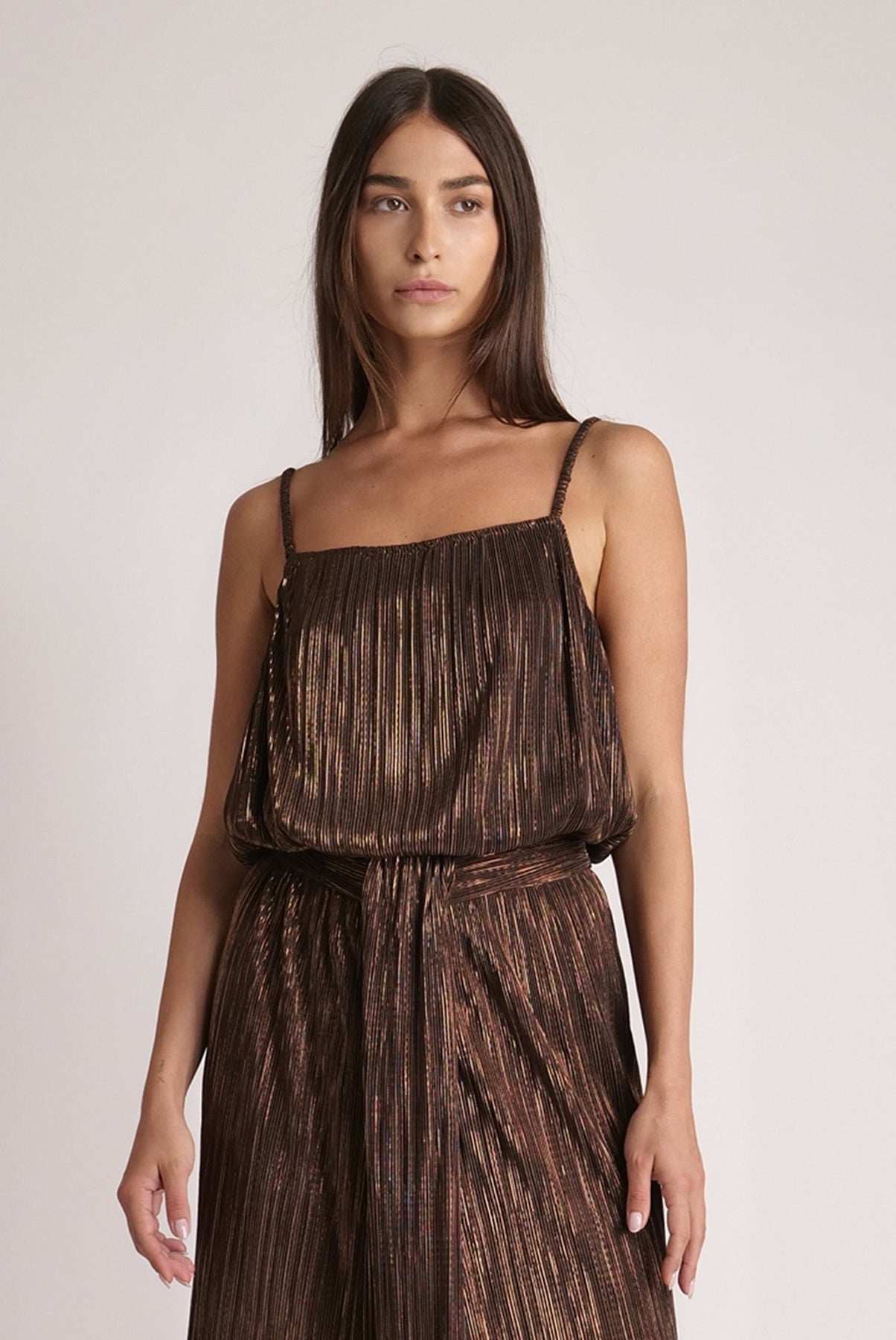 Pleated knit with foil top with adjustable straps, and ruched gathering at the waist.