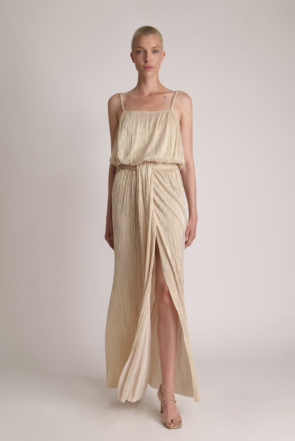 Pleated knit with foil top with adjustable straps, and ruched gathering at the waist.
