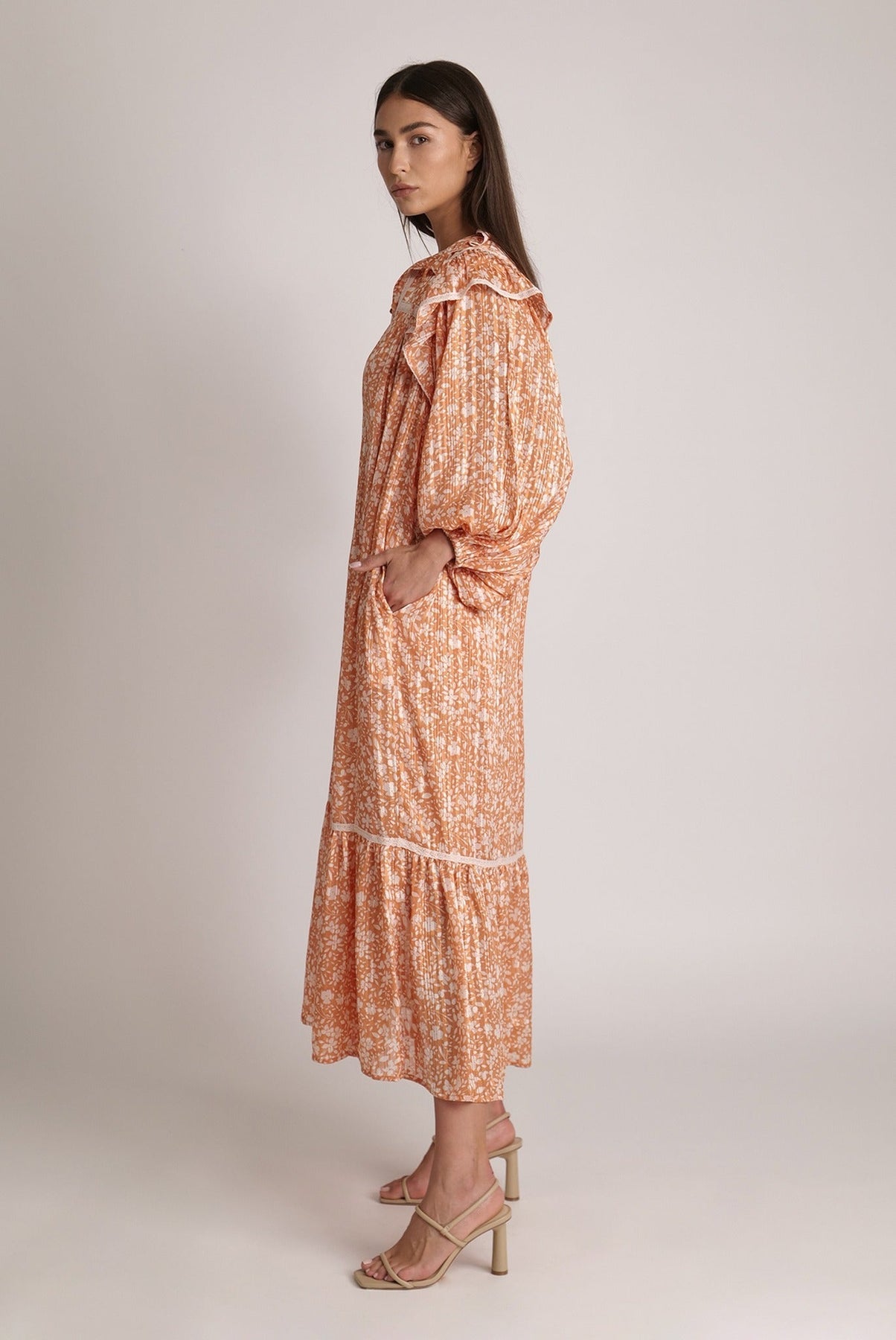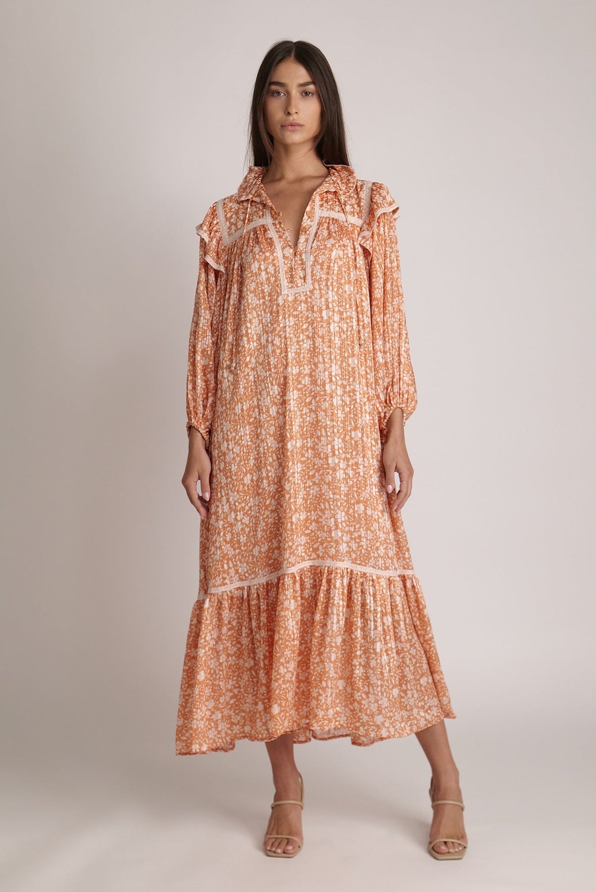 Floral chiffon with lurex ruffle midi dress with victorian style crochet trim collar, and puff long sleeves.