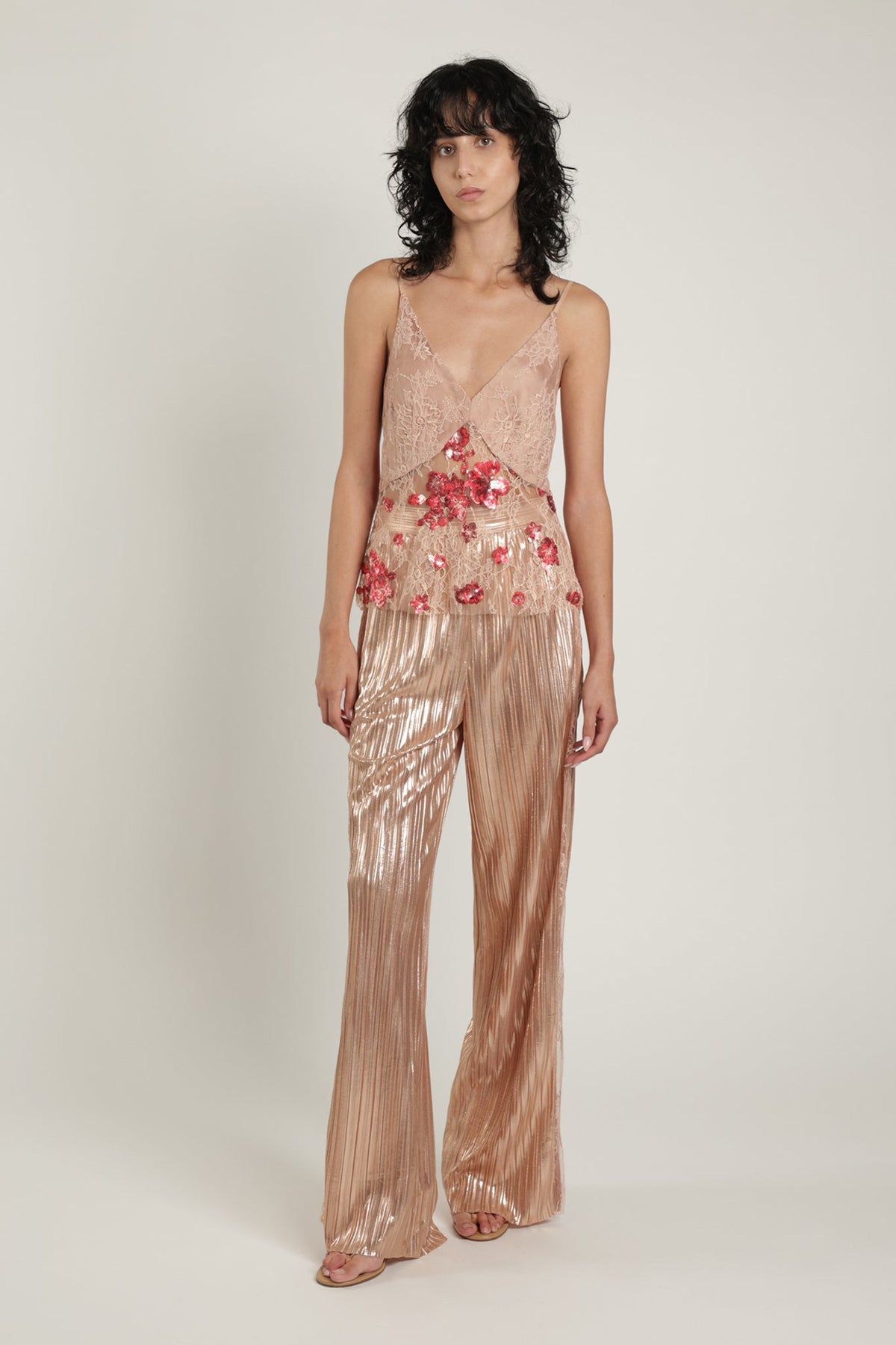Floral sequin on soltice lace V-neckline top with thin straps.