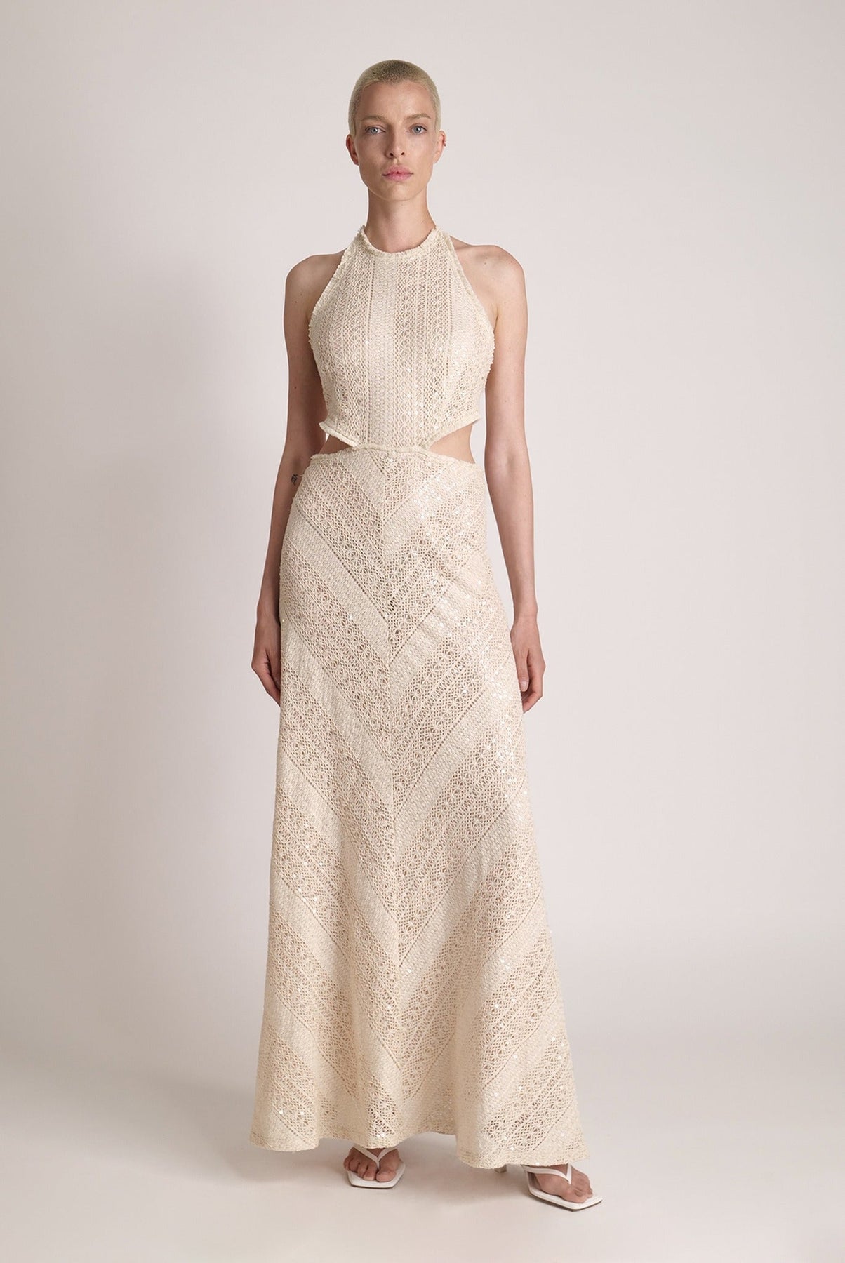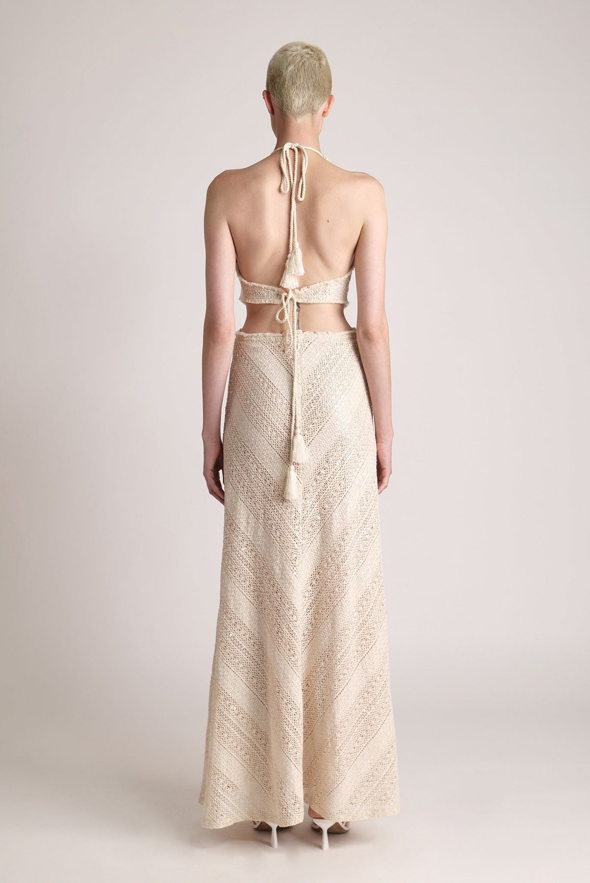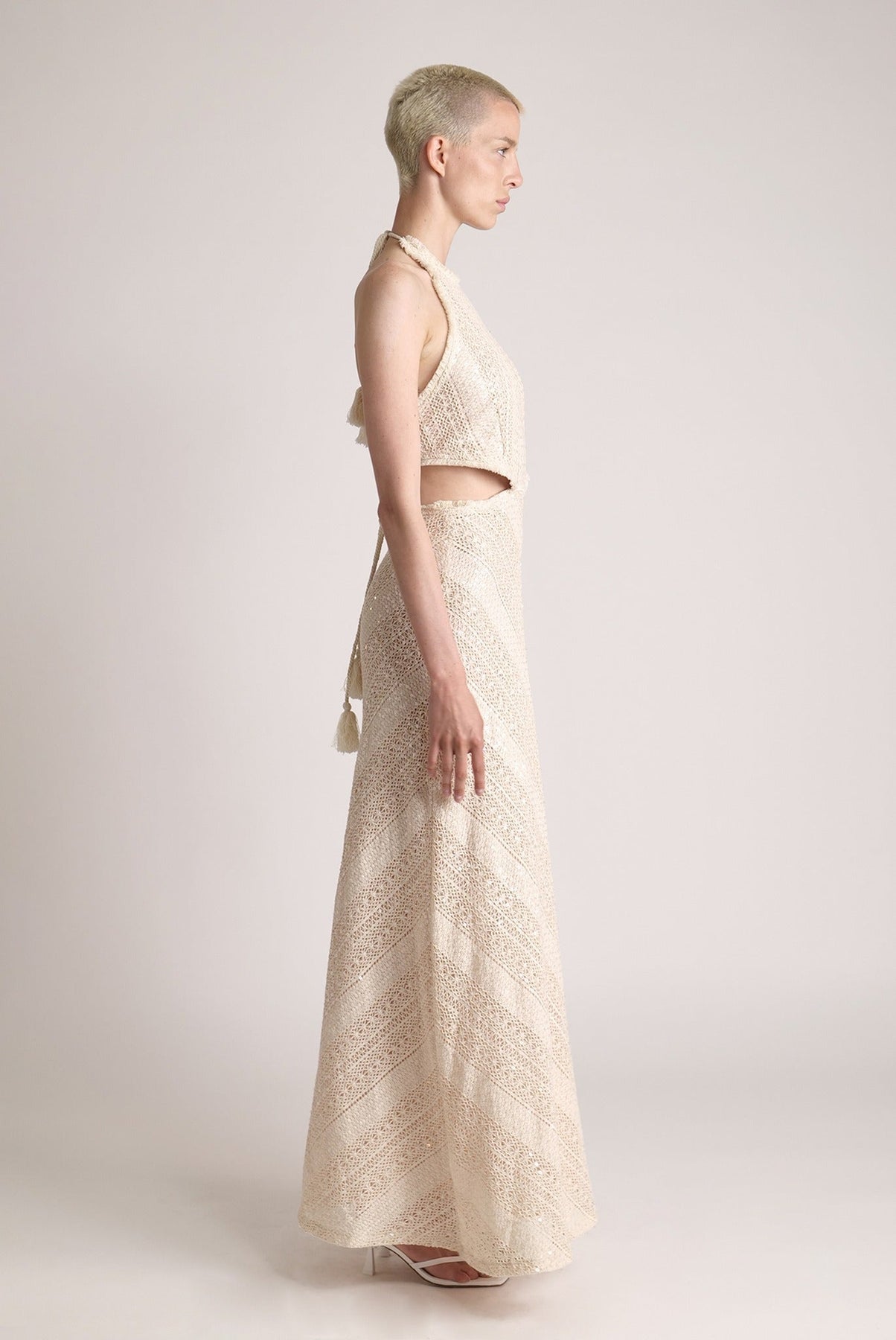 Sequined crochet flared dress with thin straps, and a tie, opening at the waist and back with matching lining.