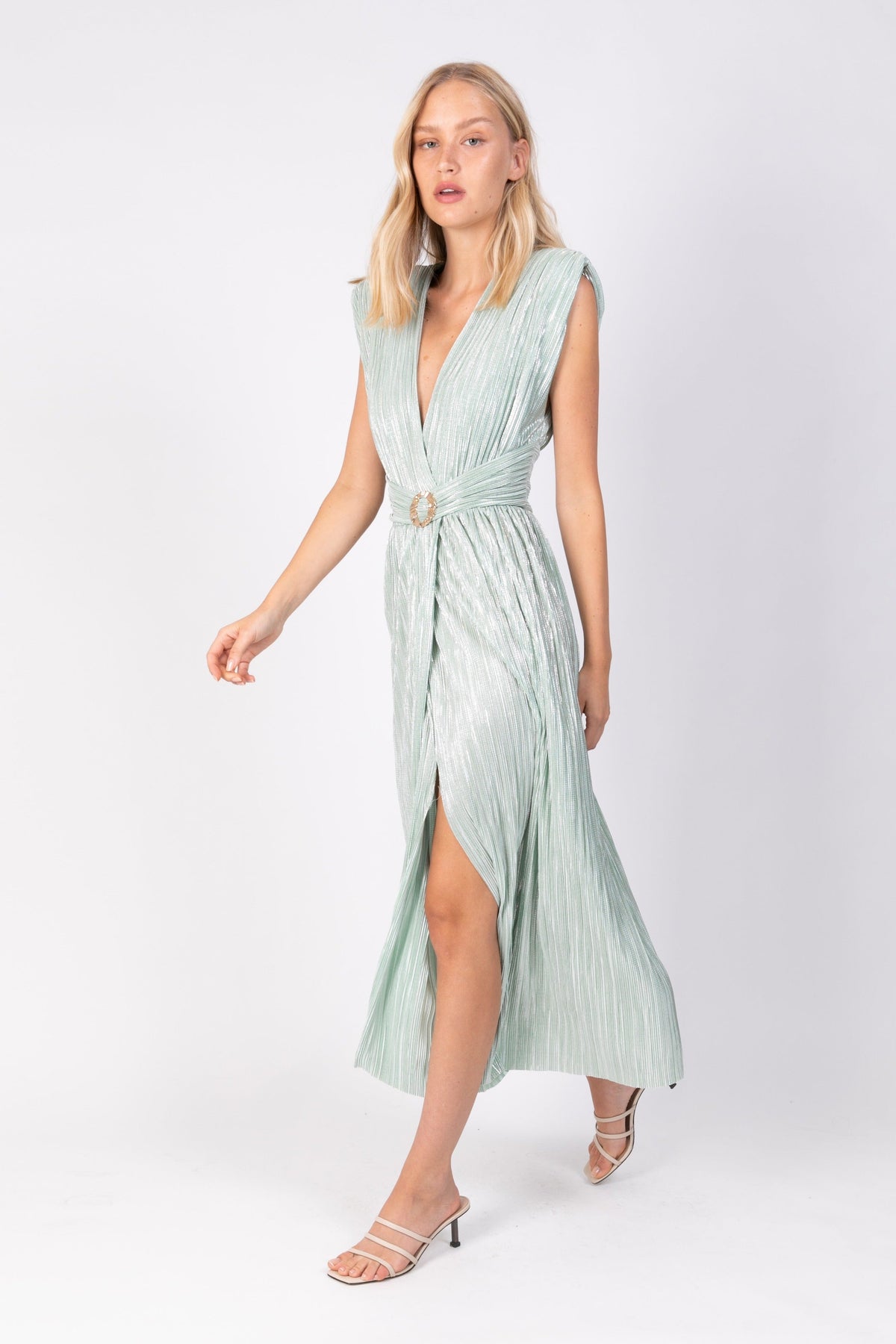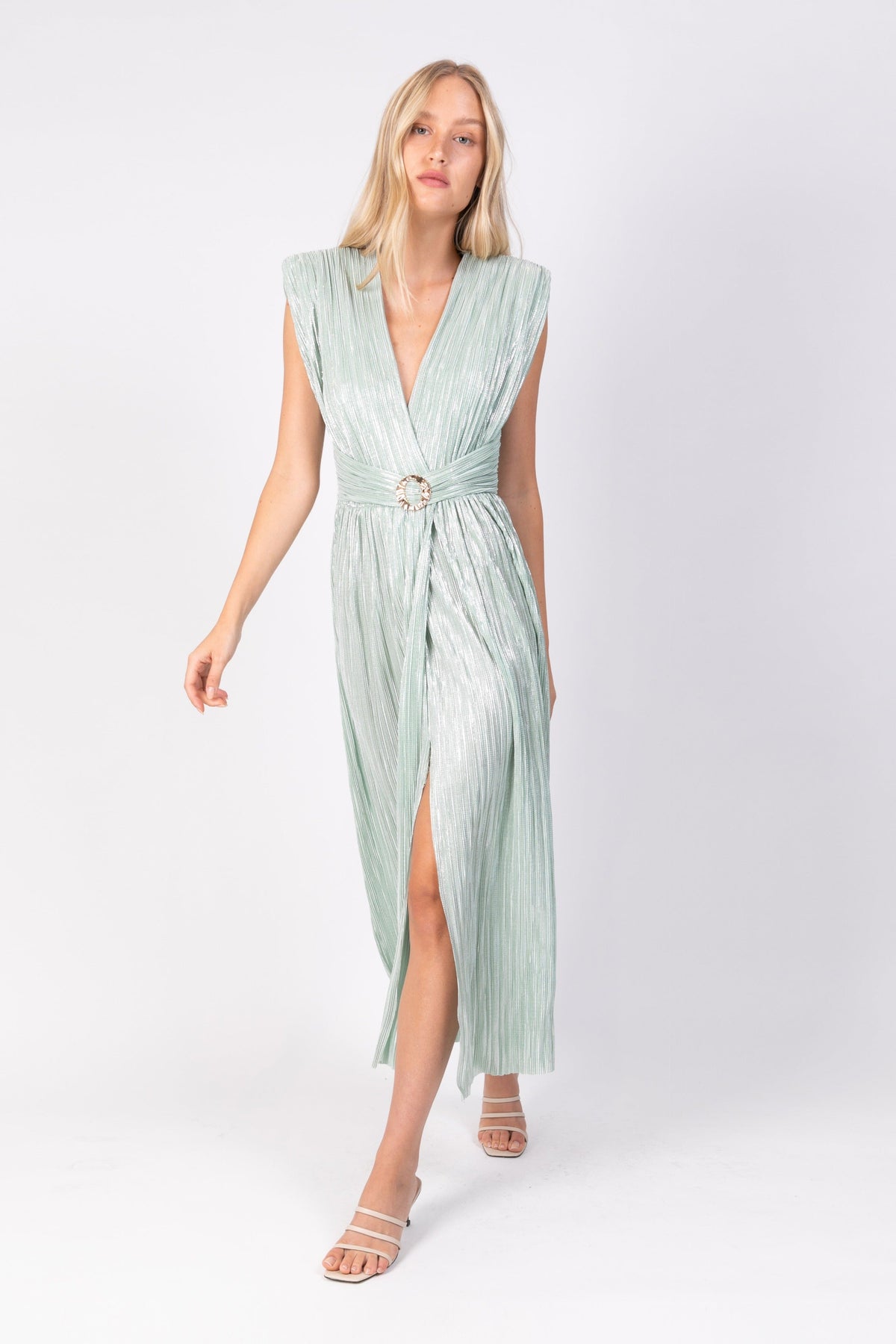 Pleated knit with foil V-neck dress with shoulder pads, side slit, and connected belt with a golden buckle.