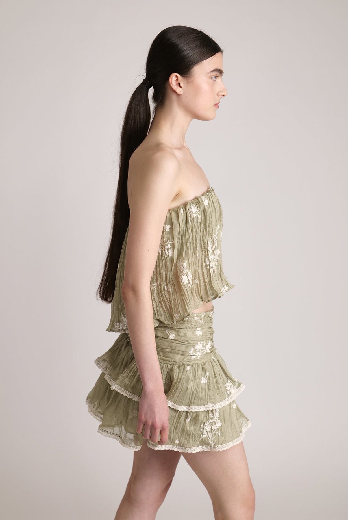 Pleated chiffon with embroidery flared strapless top.