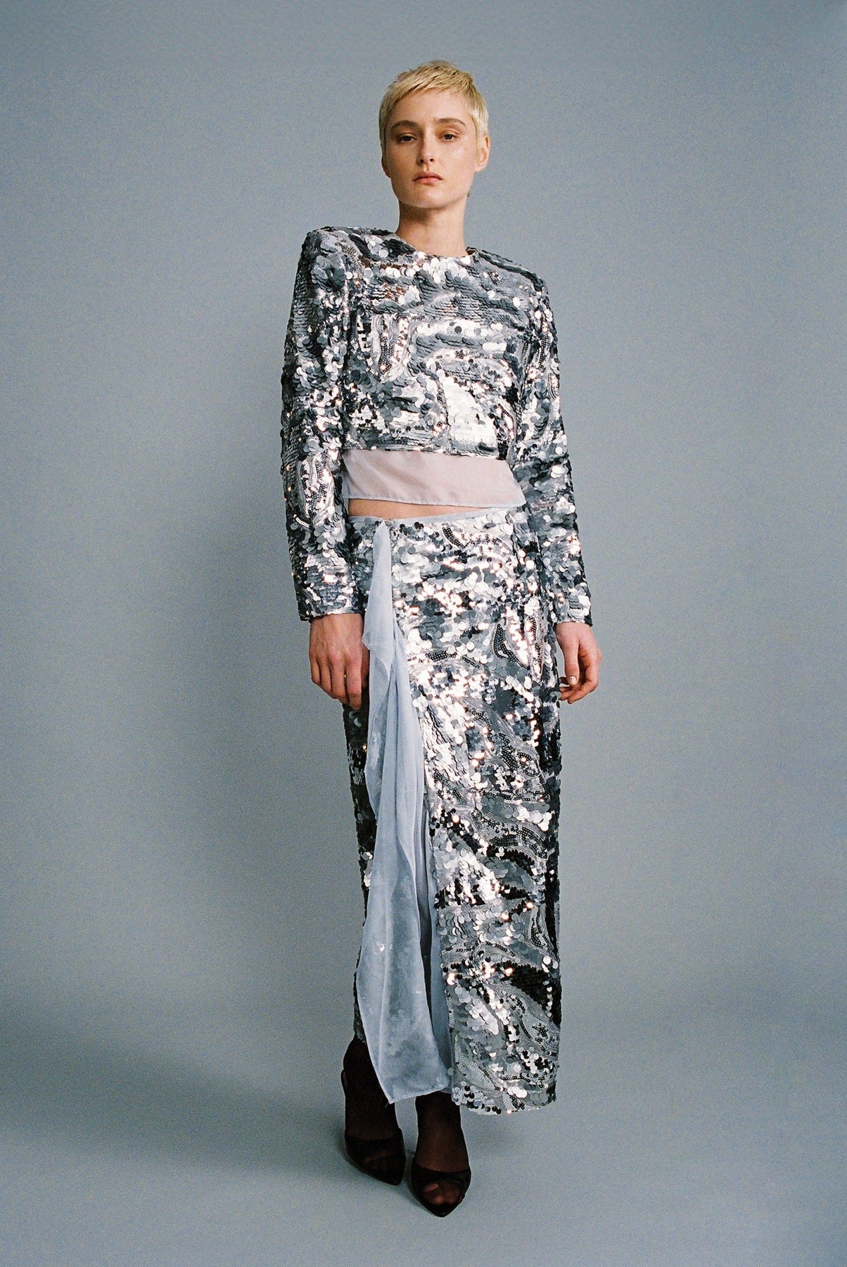Gradient sequins on chiffon crop top with long sleeves, and open back.
