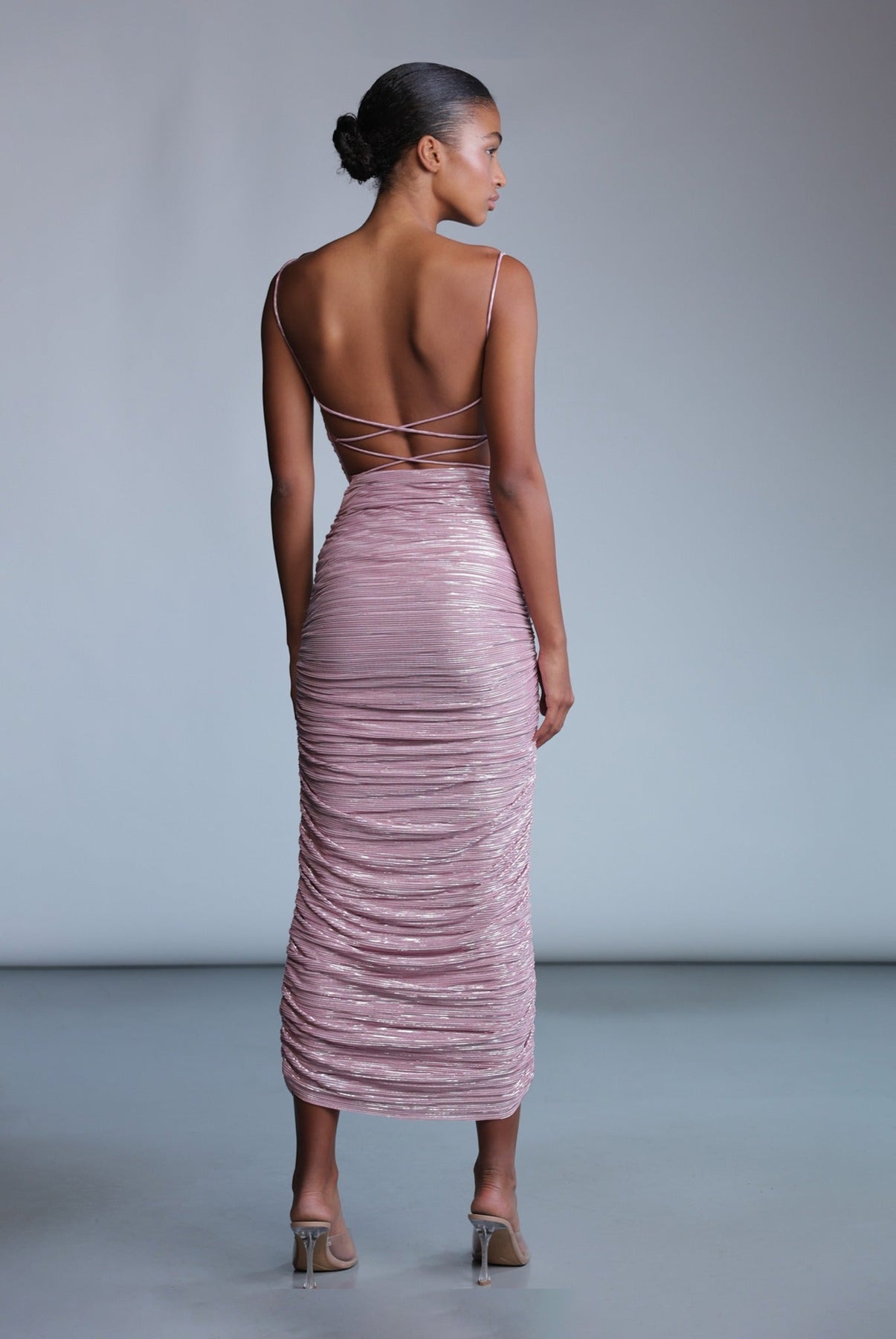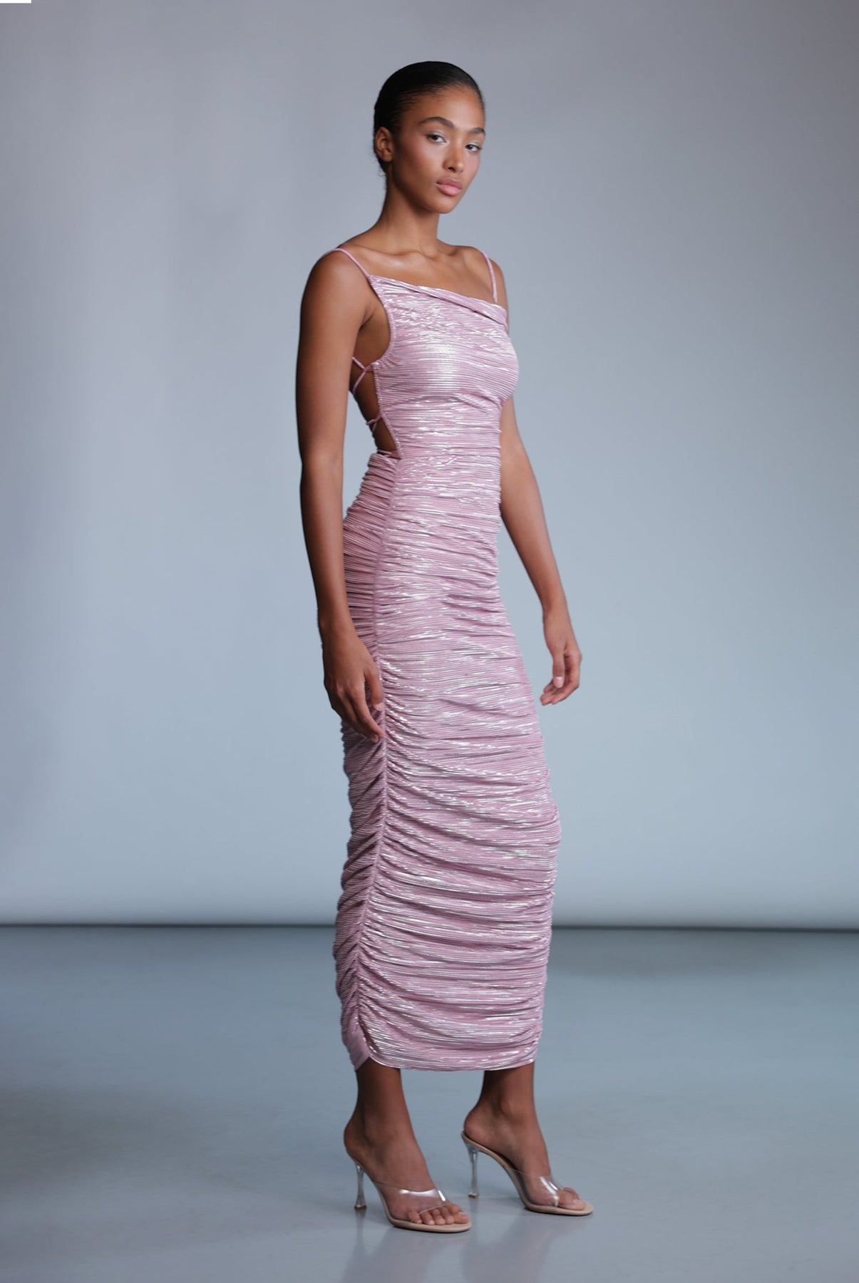 Pleated knit with foil midi dress with asymmetrical top featuring adjustable thin straps that cross at the back with a tie.