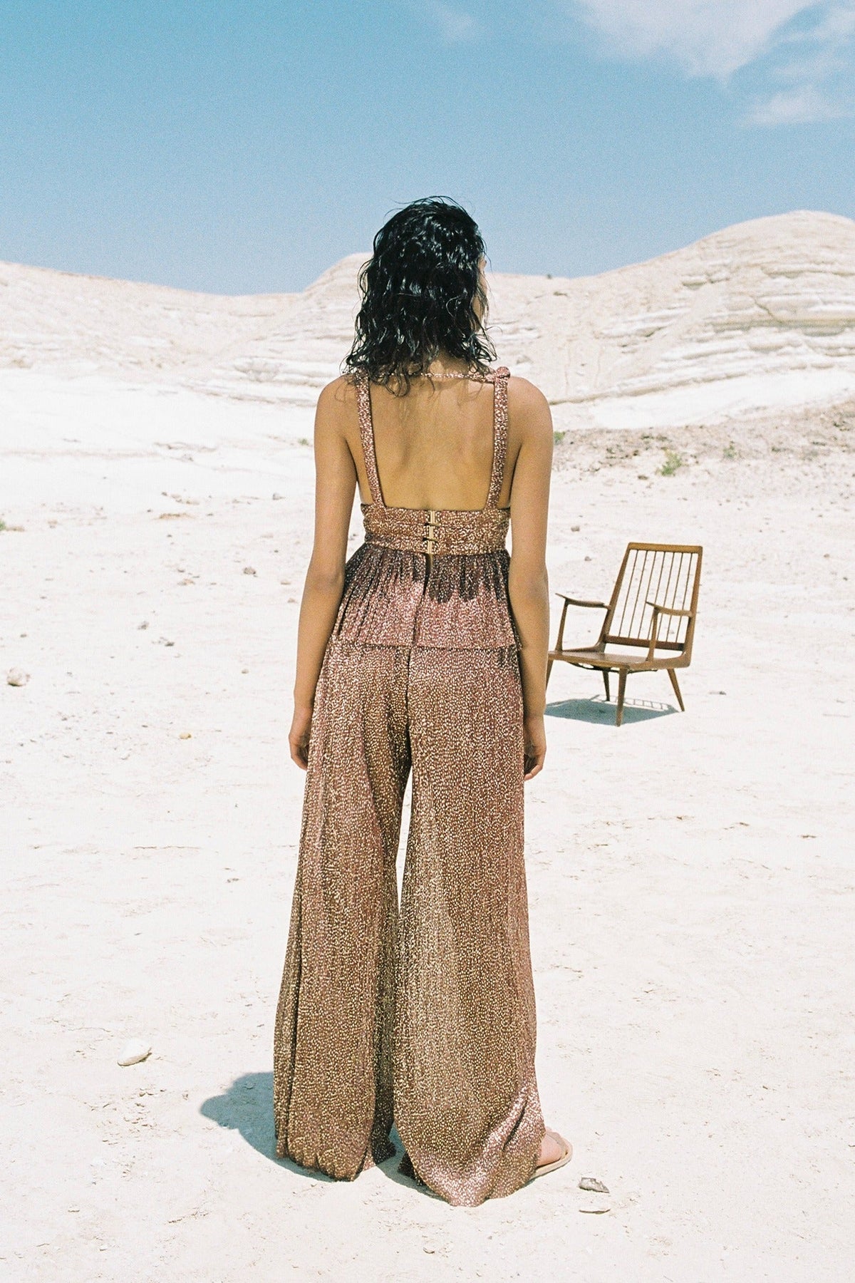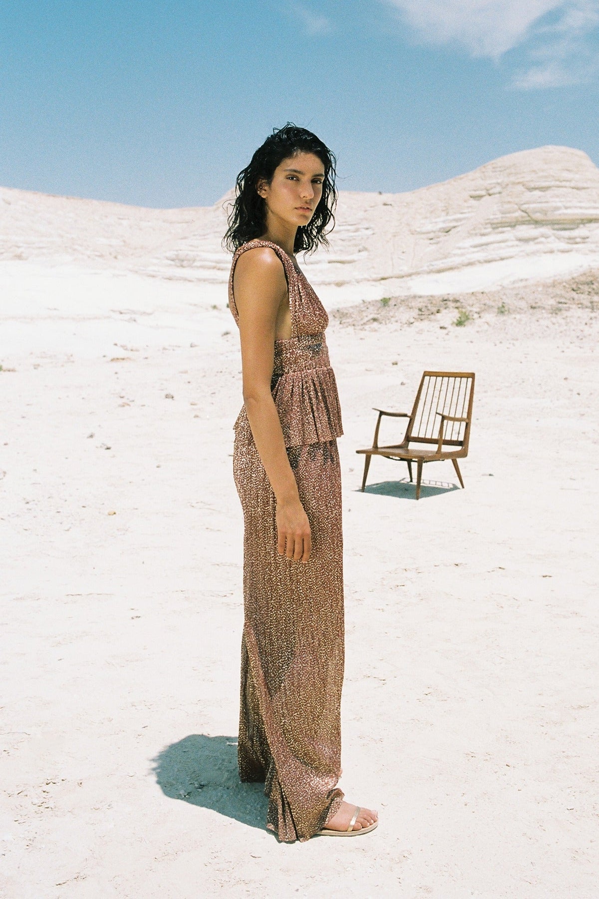 Pleated knit with speckled foil top with a V-neckline, cinched waist with peplum, and open back with 3 buckles fastening.