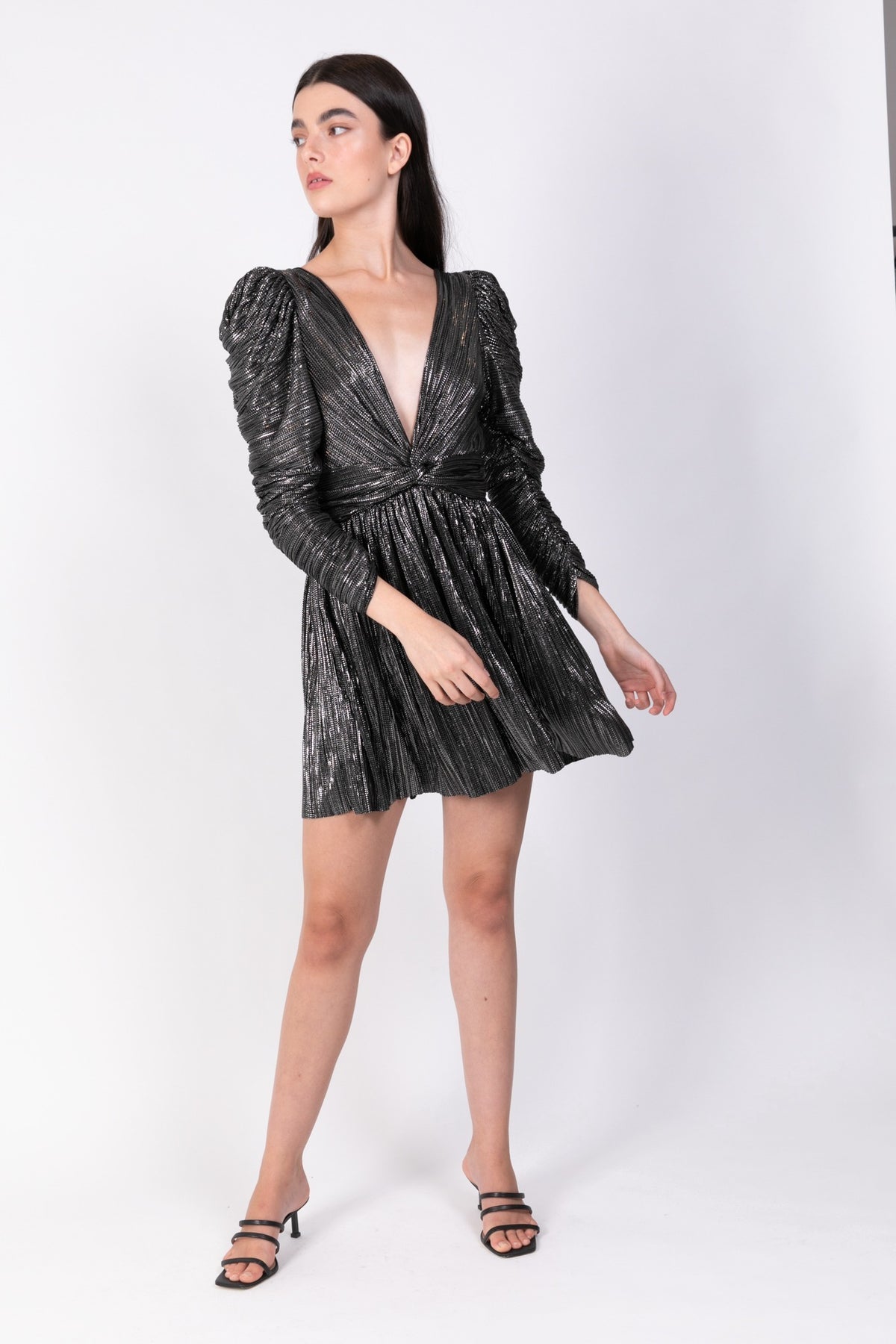 Pleated knit with foil v-neck mini dress with twisted waist detail and draped sleeves.