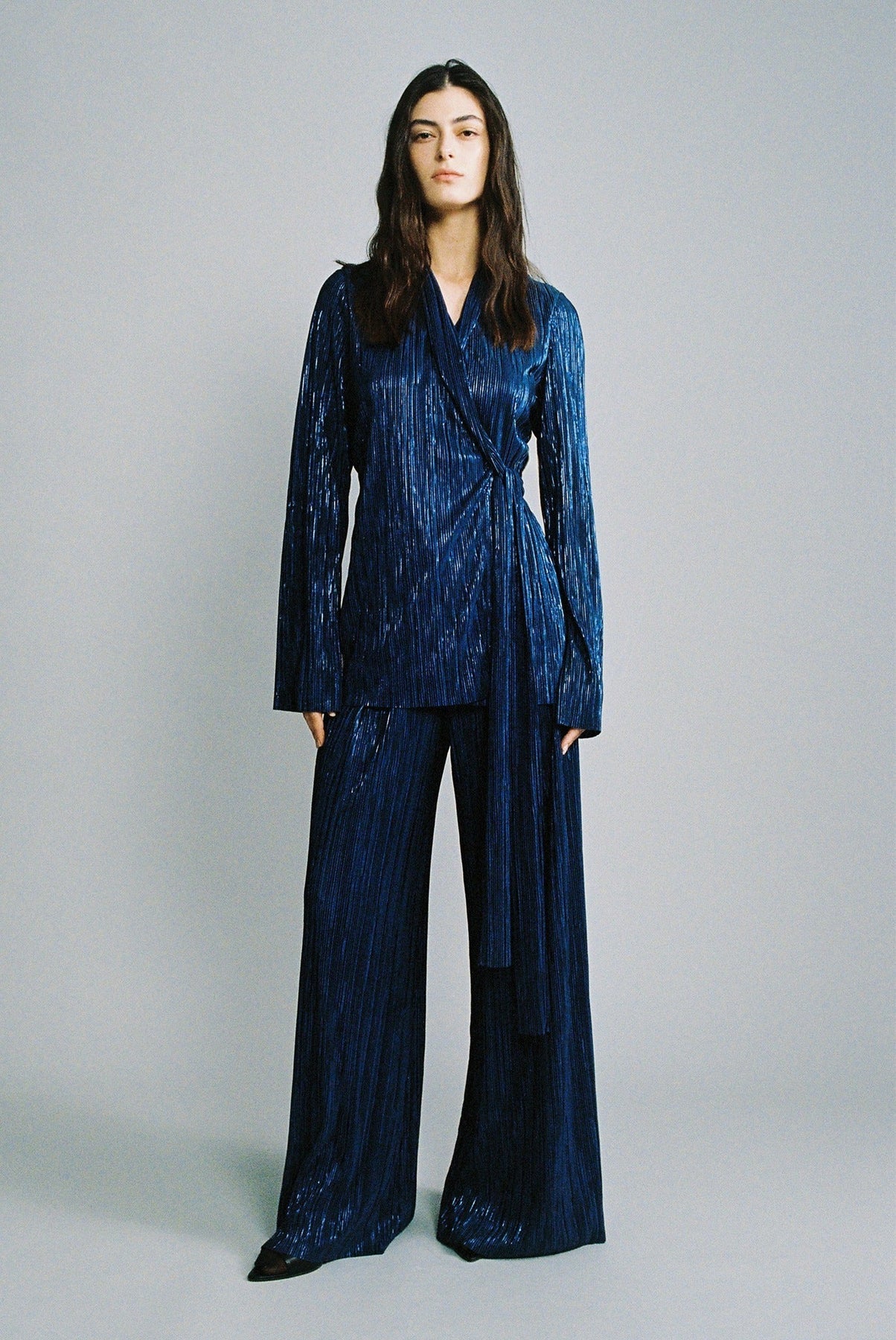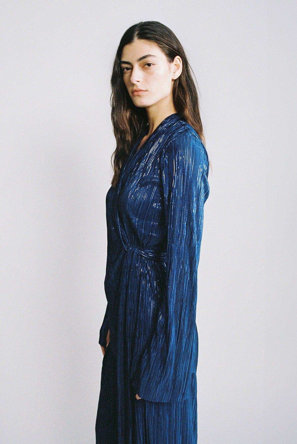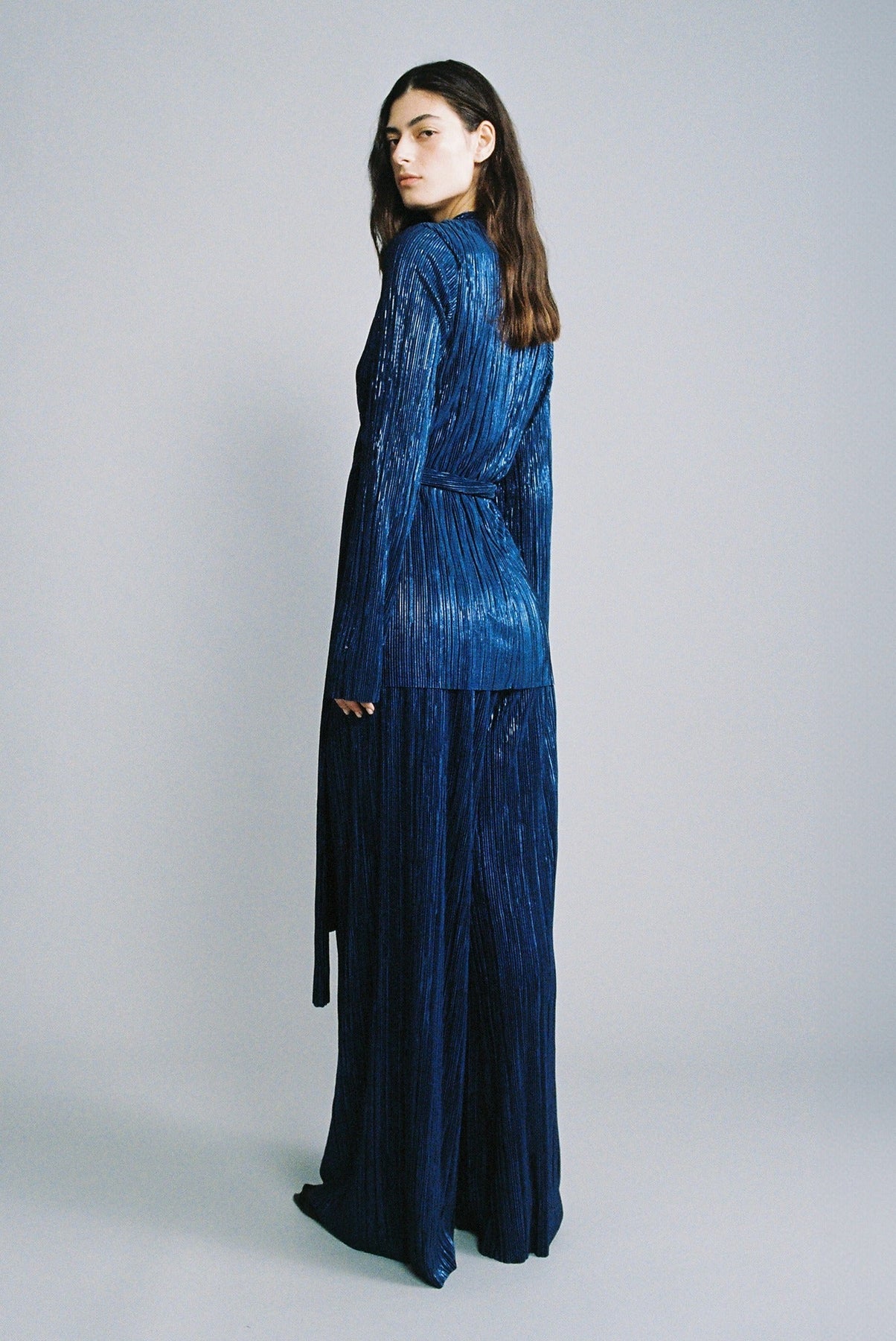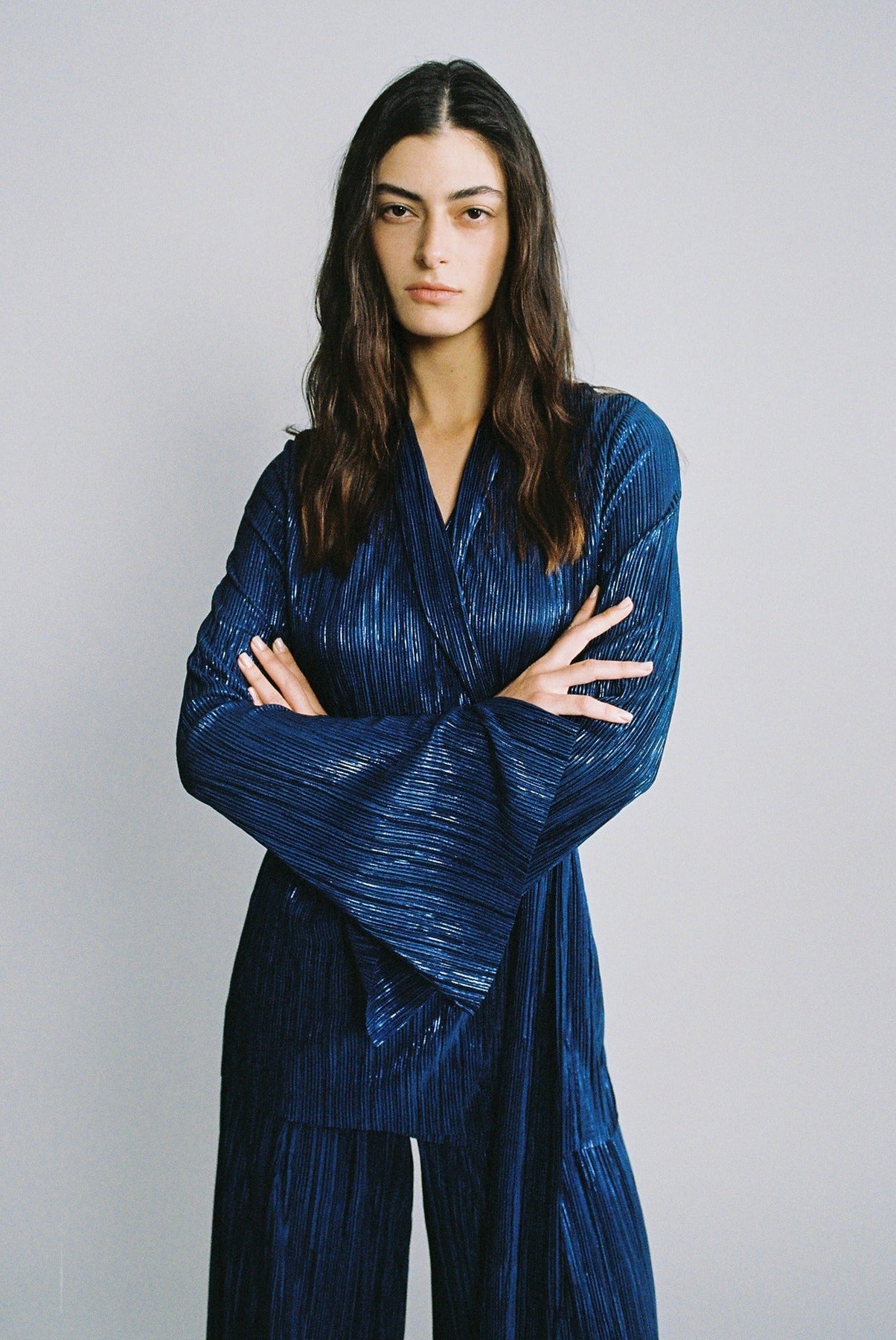 Pleated knit with foil collared top with crossover closure, long sleeves with slit at the hem.
