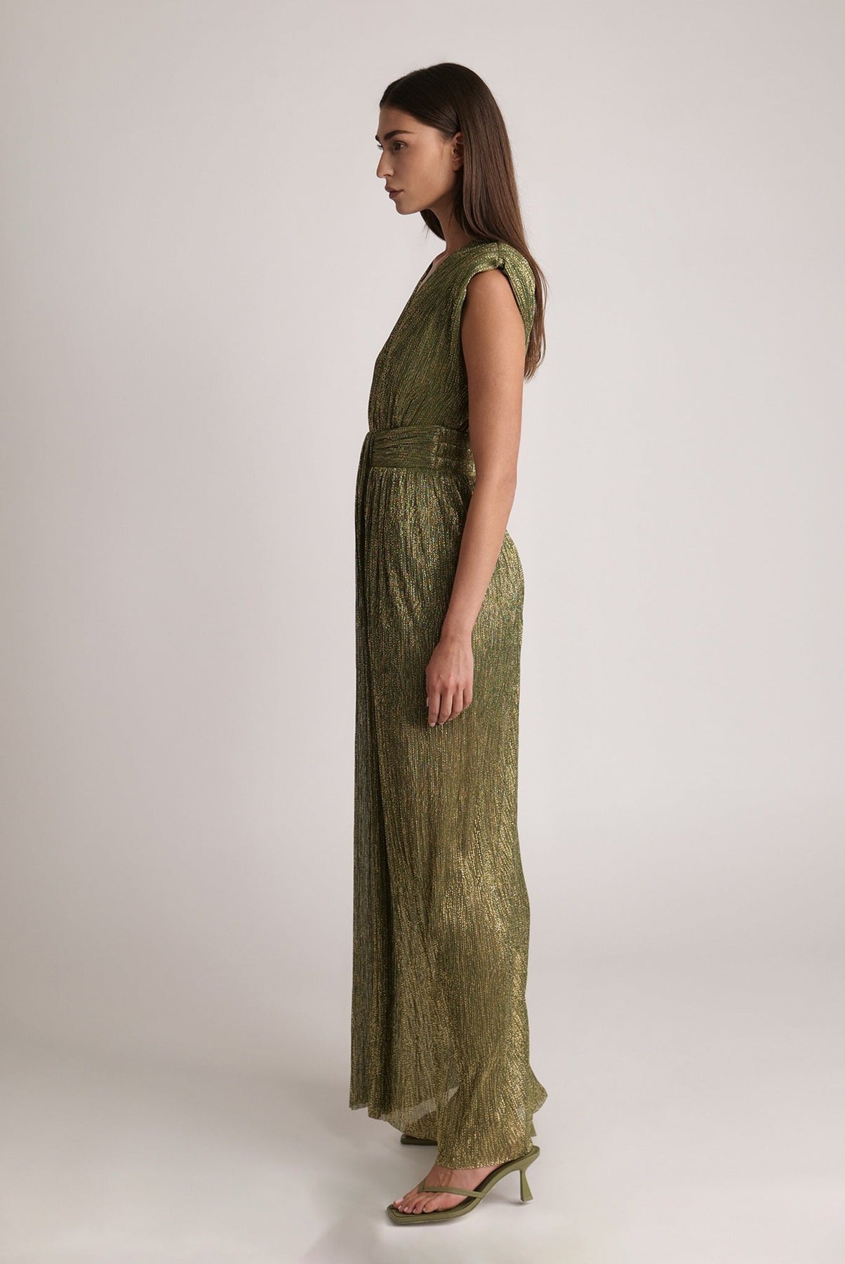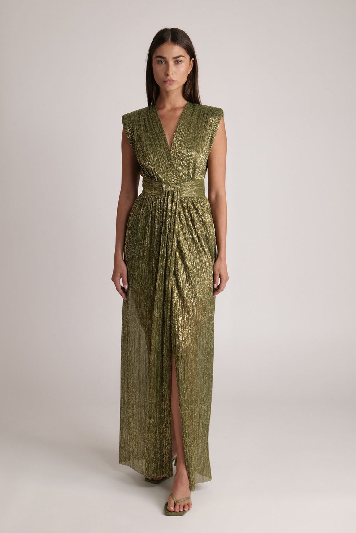 Ray lurex with sprinkled foil sleeveless maxi wrap dress featuring a deep V-neckline, shoulder pads, and front slit. Draped fabric detail at front, deep open back with adjustable strap and invisible zipper.