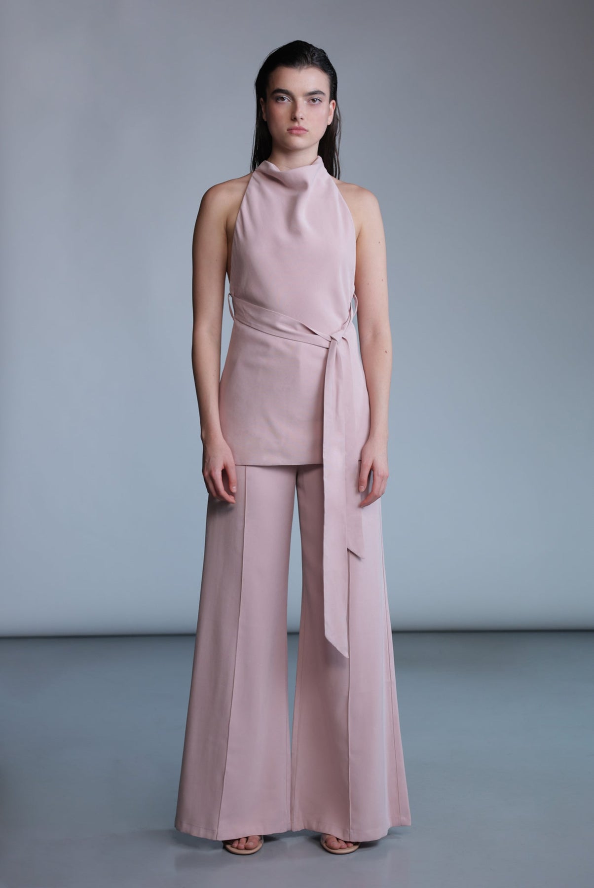 Diagonal viscose blend wide leg featuring side pockets, and button fastening on the front.