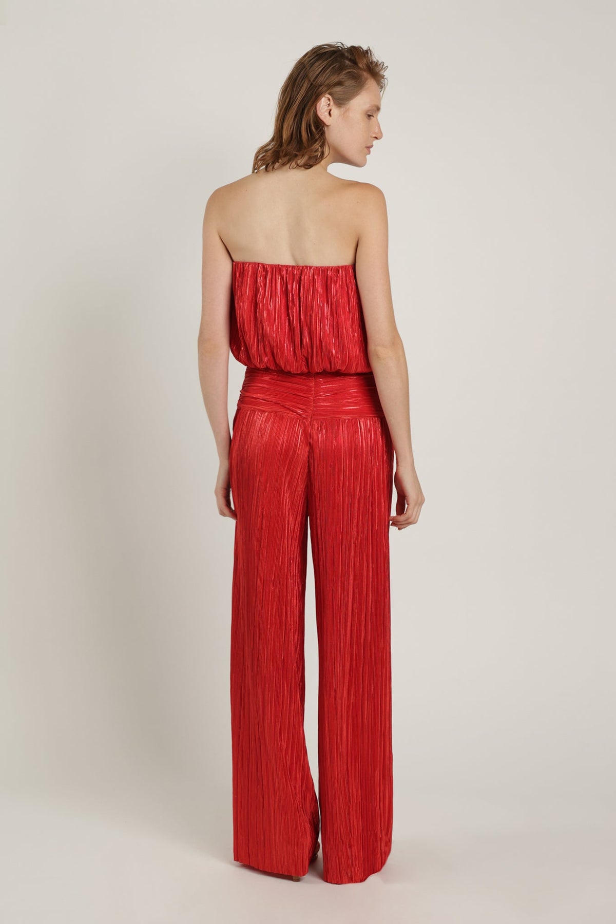 Pleated knit with foil long pants featuring a unique twist gathering detail on the waistline, and invisible back zipper fastening.
