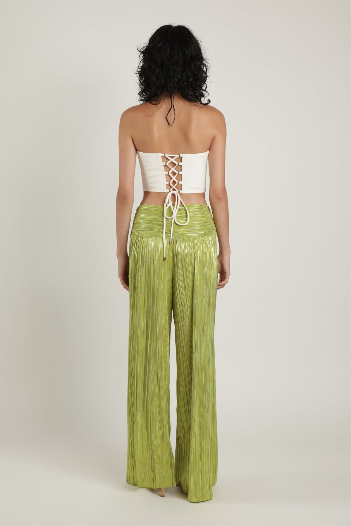 Pleated knit with foil long pants featuring a unique twist gathering detail on the waistline, and invisible back zipper fastening.