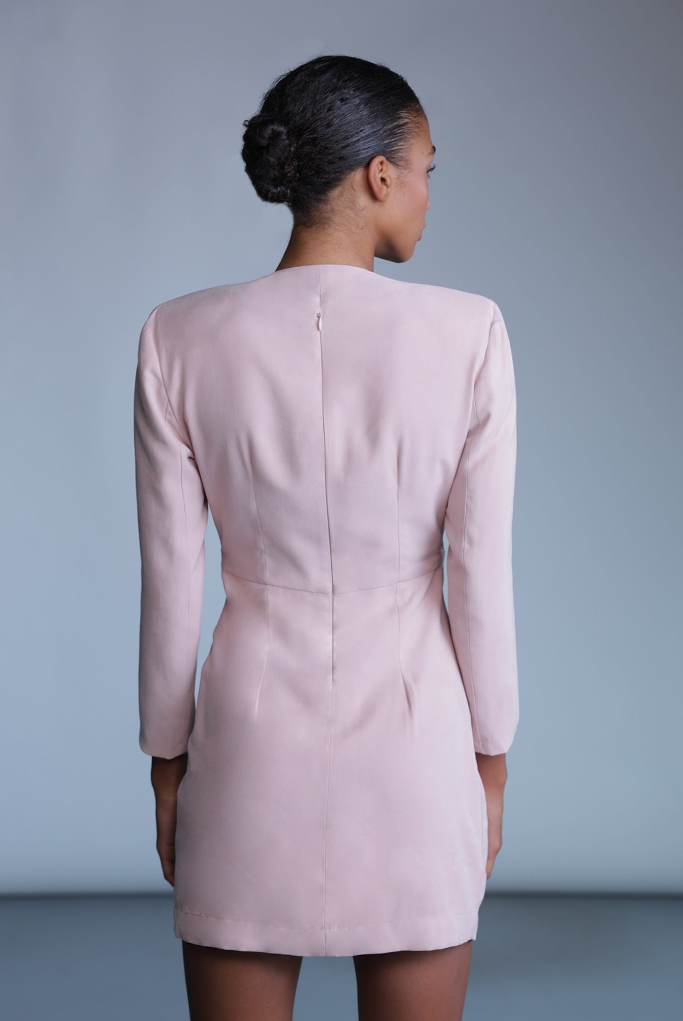 Diagonal viscose blend deep V-neckline mini dress, padded shoulders, gathering details at center front, and invisible zipper at the back.