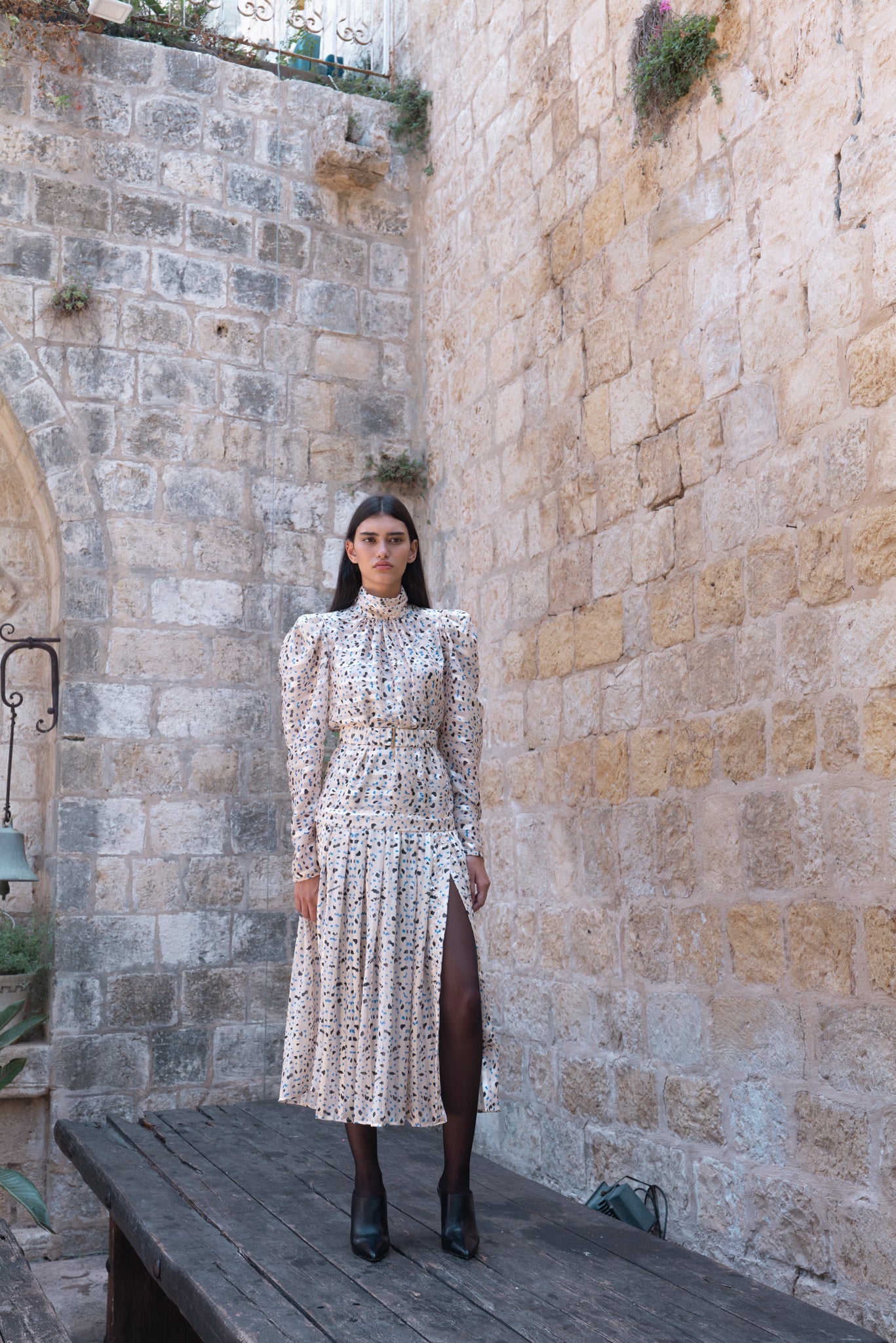 Printed chiffon midi dress features a mock neck with gathering, puffy long sleeves with button closure, and pleats at drop waist featuring a side slit with buttons.