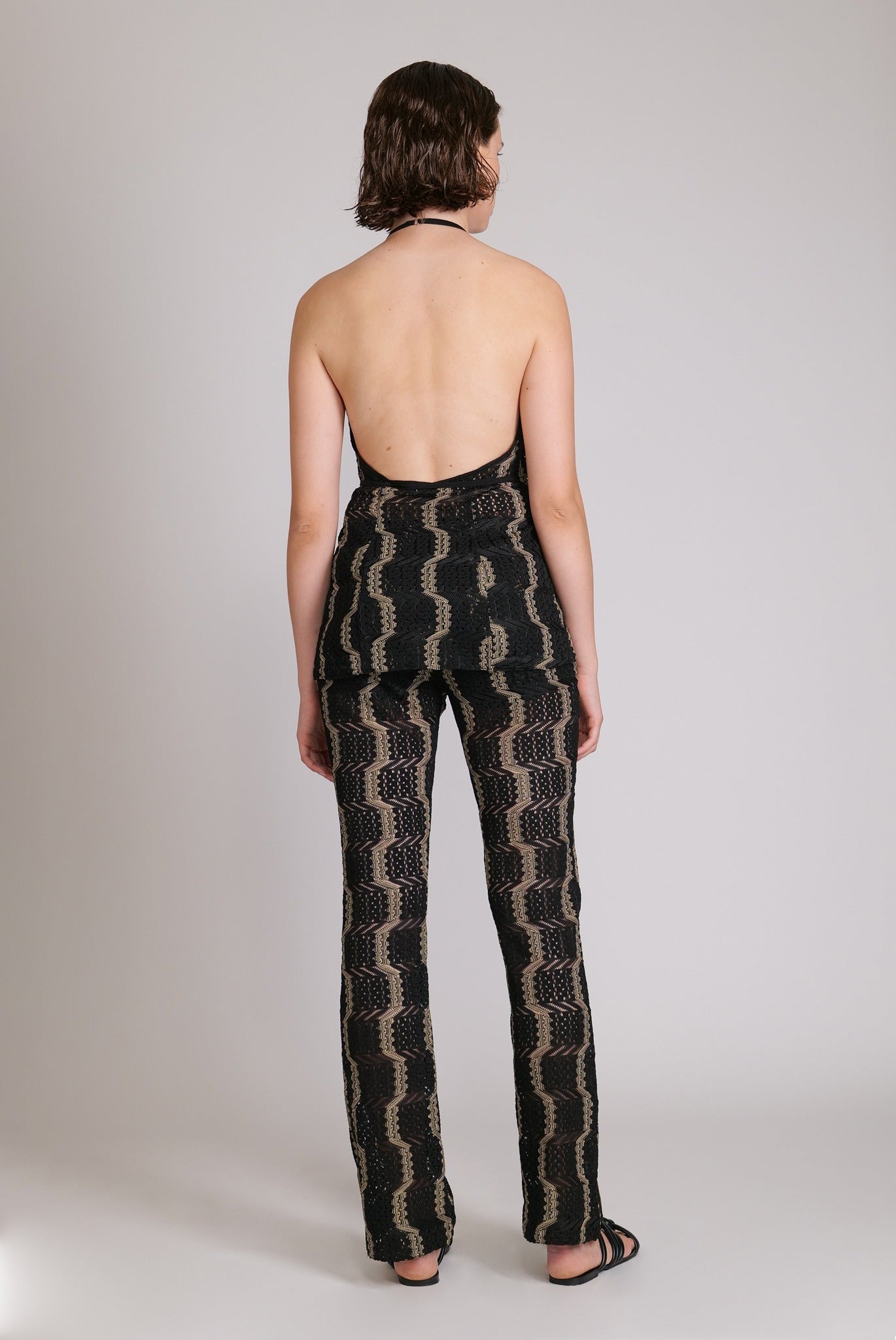 Crochet high-waist flared trousers with knit shorts lining, and invisible back zip fastening.