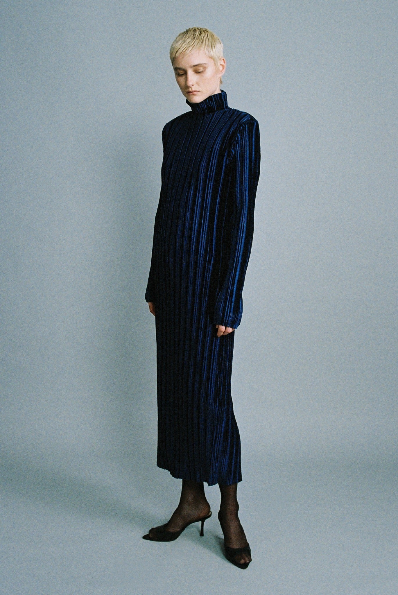 Pleated velvet midi dress with high neck, back slit at the hem, and long sleeves.