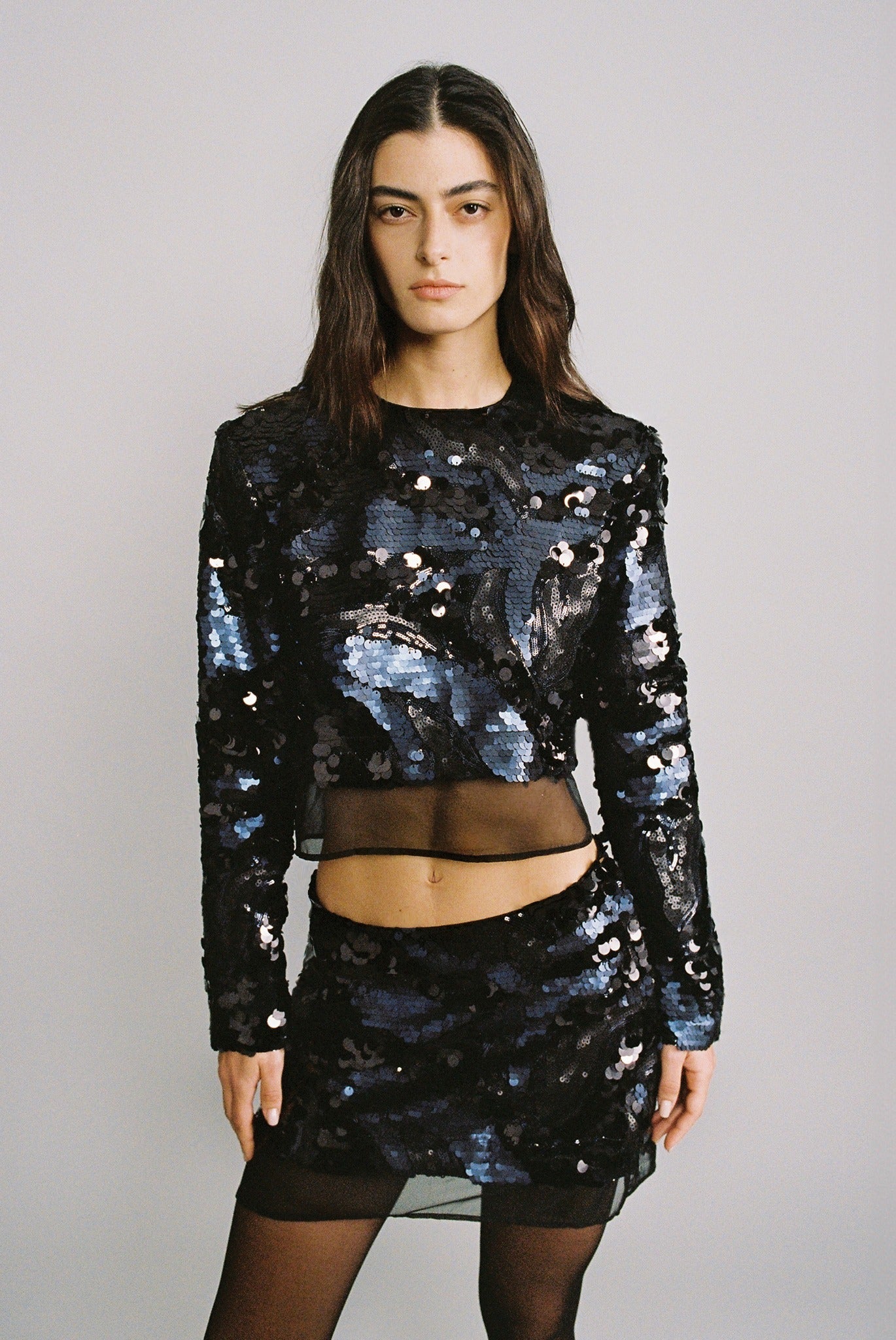 Gradient sequins on chiffon crop top with long sleeves, and open back.