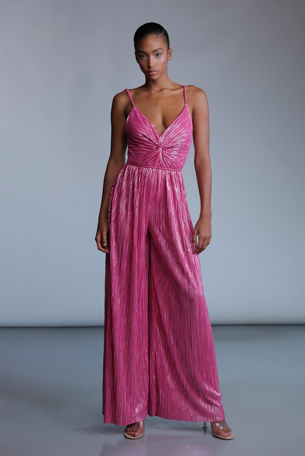 Pleated knit with foil wide leg jumpsuit with twist knot detail at front, thin adjustable straps, and invisible zipper at back.