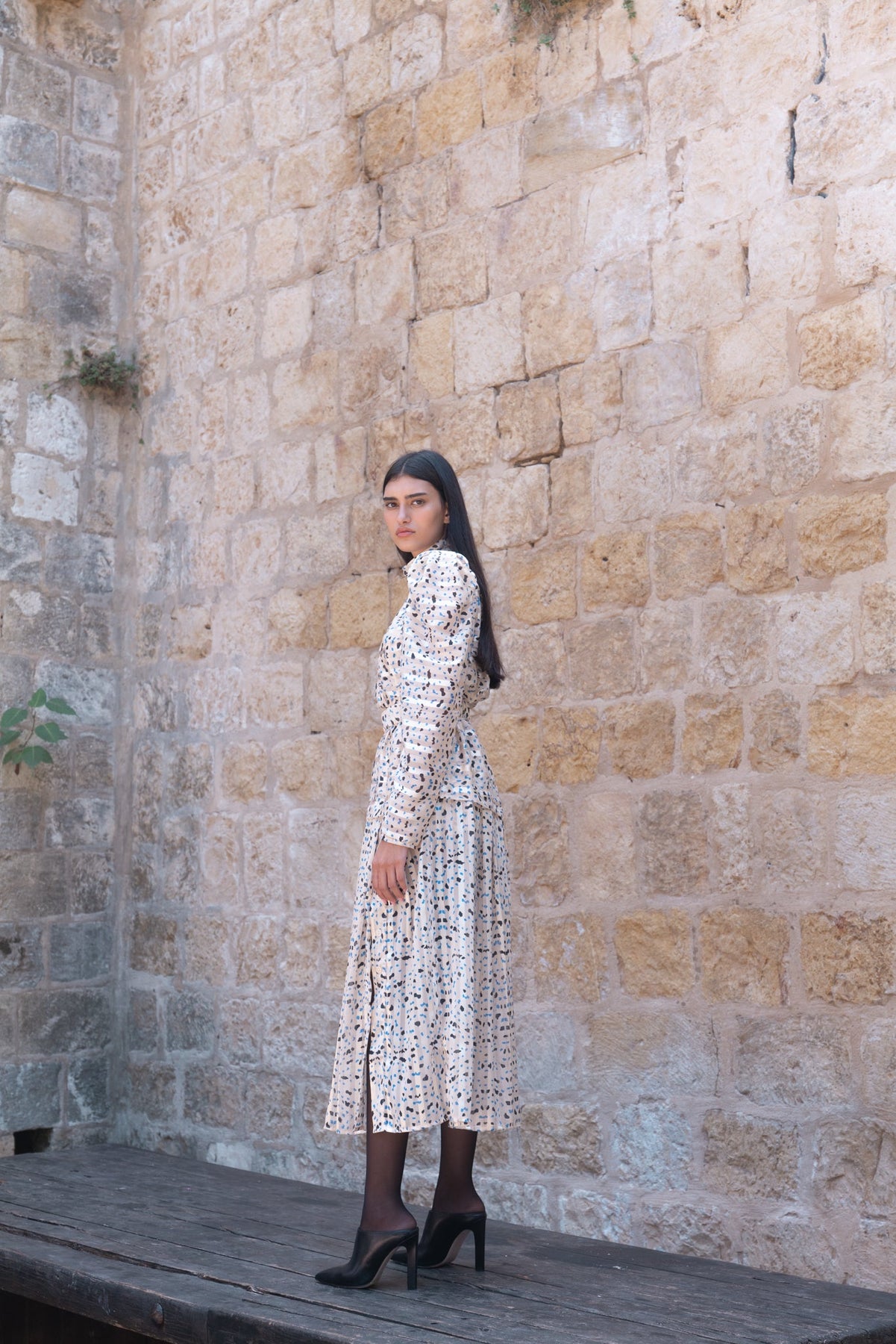 Printed chiffon midi dress features a mock neck with gathering, puffy long sleeves with button closure, and pleats at drop waist featuring a side slit with buttons.