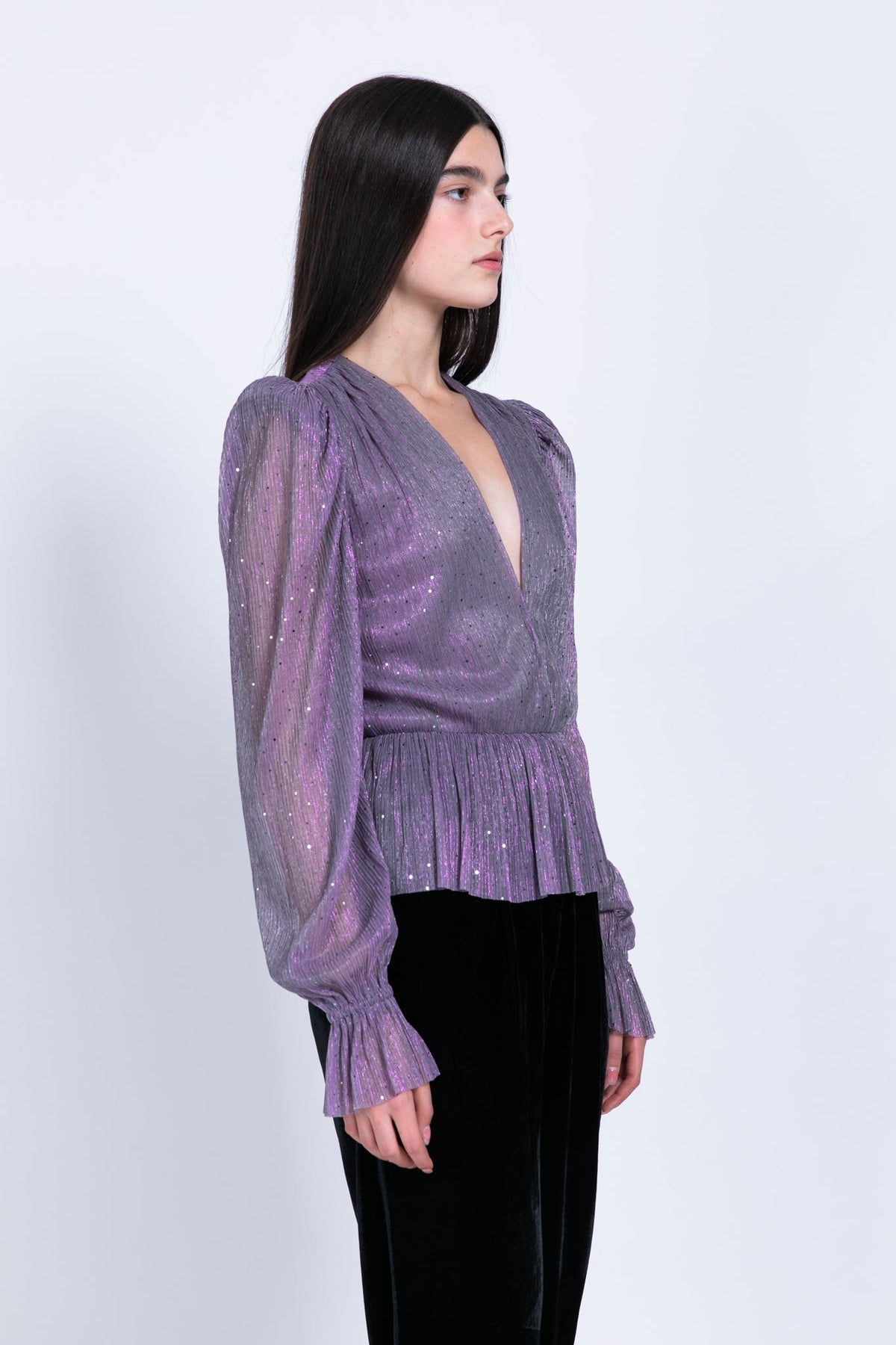 Pleated knit with sequins peplum top with v-neck, and puffy long sleeves with cinched cuffs, and gathering at the waist.