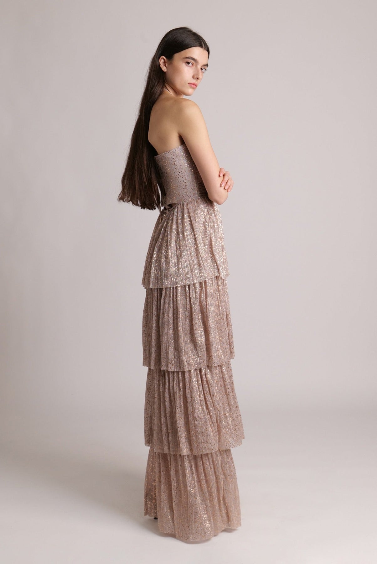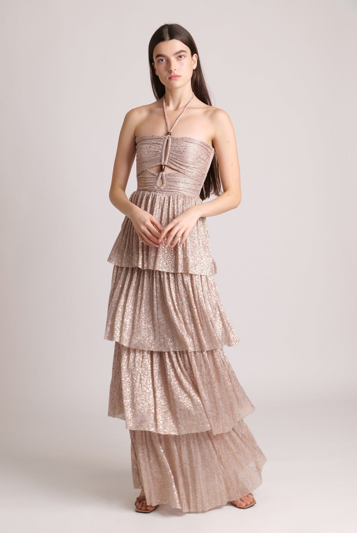 Pleated knit with multi dot foil maxi dress with an adjustable halter neckline and elastic straps, features a unique front cutout. Opened back with lacing, an invisible zipper, and a layered skirt.