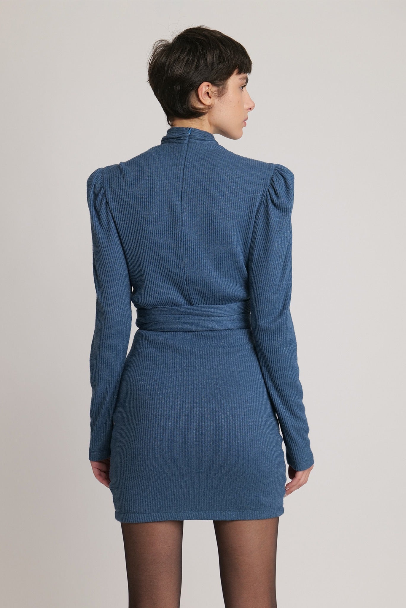 Lurex rib knit dress with asymmetrical draping, puffed shoulders, and gathered details.